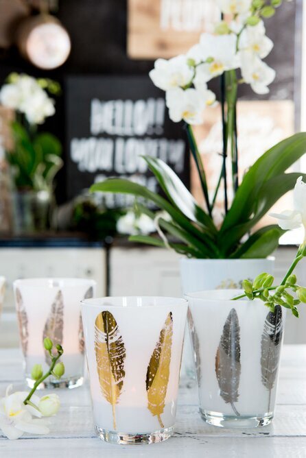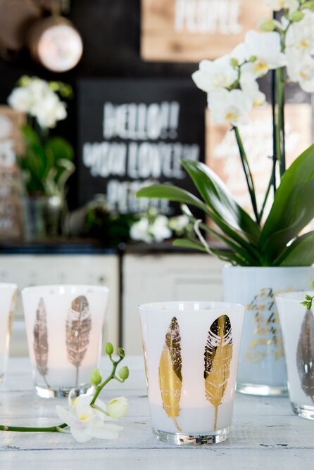 Lykta med vackra fjädrar i 100% bladguld. Vattentålig men ska dock ej diskas i maskin. Läs mer