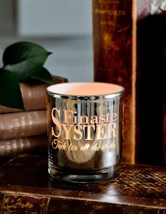 Den detaljerade designen av ljuslyktan fångar uppmärksamhet med dess glänsande yta och tydliga inskription, där orden är präglade i ett elegant typsnitt. Budskapet, "Finaste Syster", är framhävt i mitten och skapar en känsla av värme och omtanke. Under denna text står det i mindre bokstäver tack för allt du är, vilket betonar den sentimentala aspekten av produkten. Ytan verkar vara tillverkad av glas, vilket tillför en sofistikerad glans som reflekterar omgivningens ljus mjukt.
