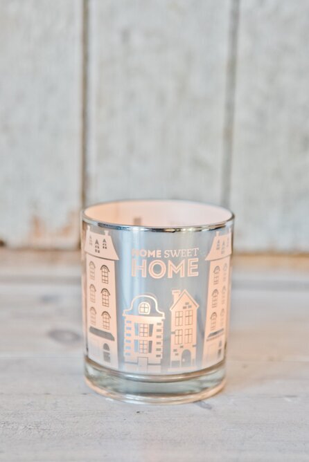 Vacker ljuslykta med texten "Home Sweet Home". Lyktan har en silvrig finish med matt vit insida.