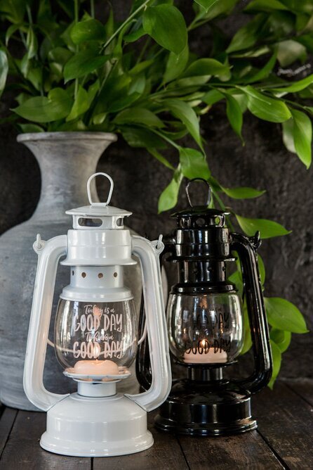 Lanterna i vit finish för värmeljus med texten: Today is a good day to have a good day. Vattentålig men ska dock ej diskas i maskin.