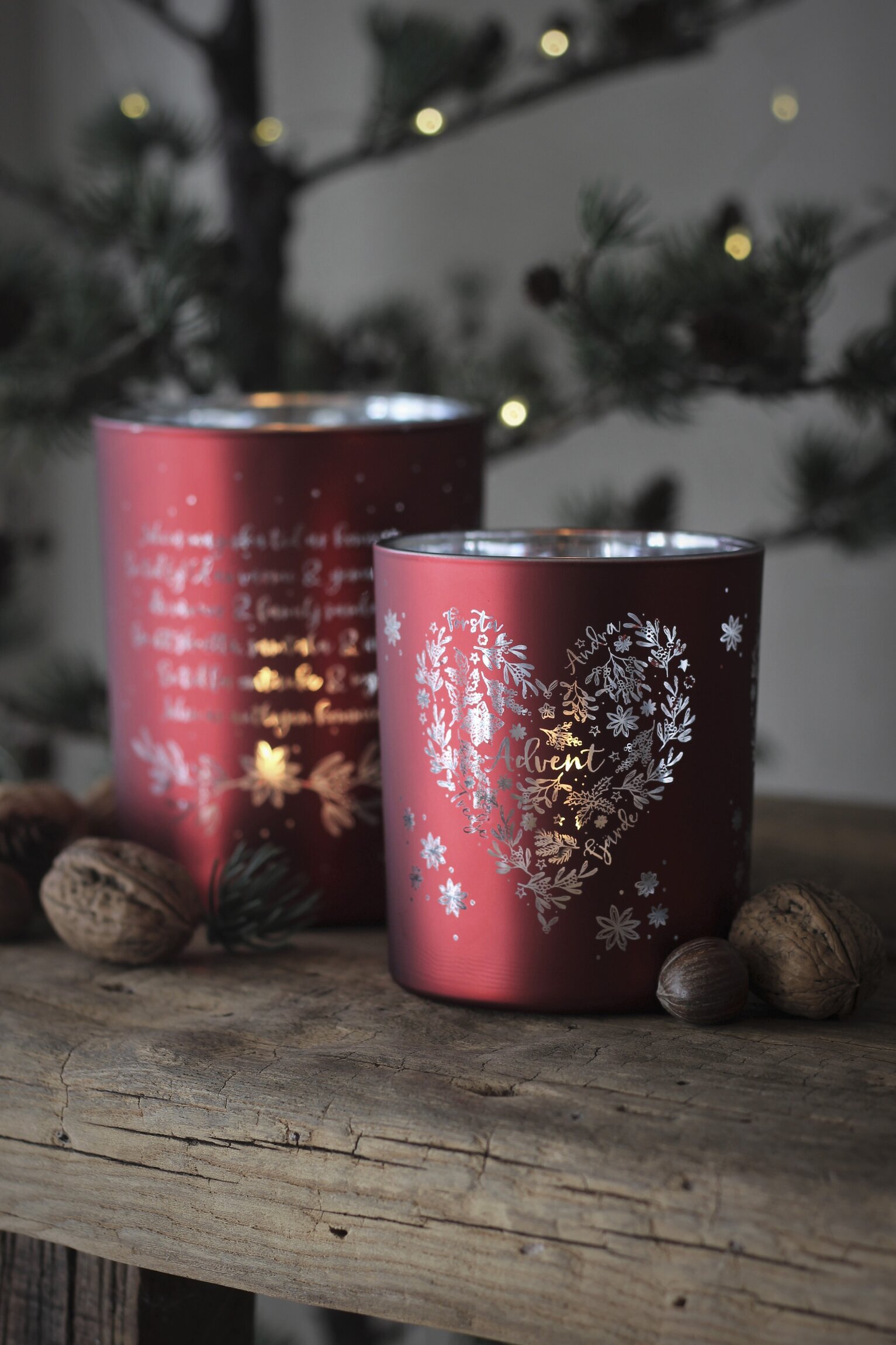 Ljuslyktorna är tillverkade i en djup röd nyans som genast för tankarna till jul och adventstidens varma traditioner. Den smalare lyktan är placerad framför den bredare, vilket skapar ett trevligt djup i bilden. Runt den främre lyktan finns ett detaljerat mönster i form av ett hjärta, dekorerat med blommor och bladverk. Texten "Advent" står i mitten av hjärtemönstret, omgiven av små, vita stjärnor som förstärker den festliga känslan.