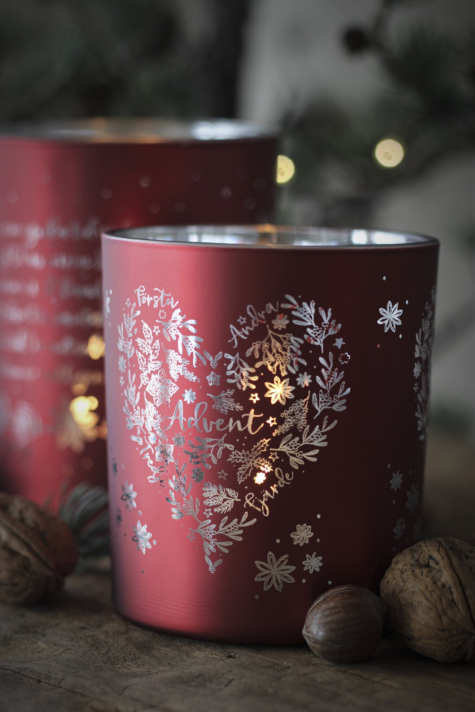 På ytan av lyktan finns ett intrikat mönster av silvriga motiv och texter. Mönstret skildrar flätade växter och blommor och formar en hjärtformad krans runt ordet "Advent", vilket ytterligare fördjupar associationerna till julens högtid och festligheter. Det går att urskilja små ord kring kransen, som markerar de olika adventssöndagarna med en lekfull stil och varierad typografi.