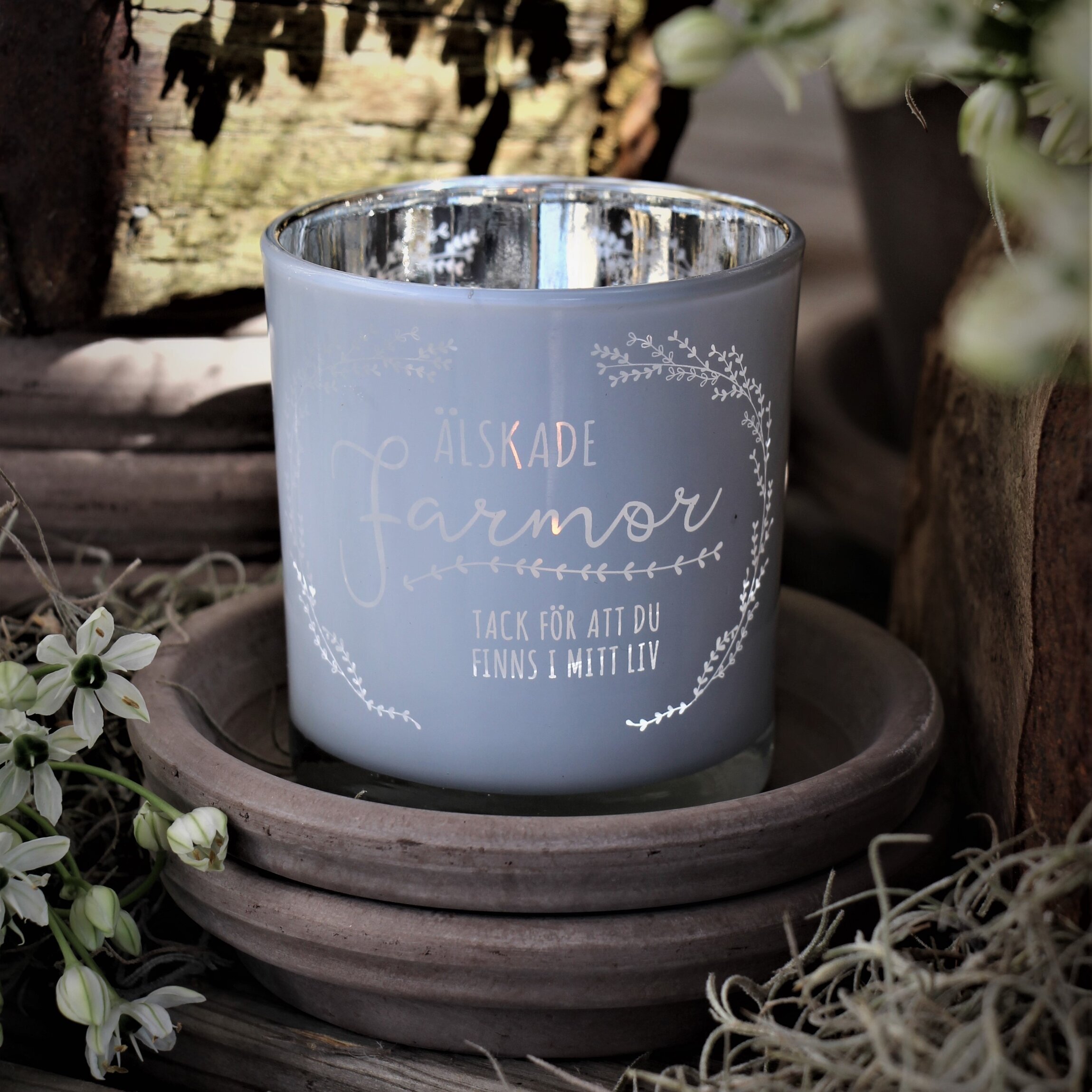 Bilden visar en ljuslykta från Köpstaden.se, specifikt en produkt från det välkända varumärket Majas Cottage, benämnd Ljuslykta Älskade Farmor. Lyktan framträder tydligt i förgrunden, omgiven av en mjuk och vilsam miljö som fångar betraktarens ögon. Dess yttre yta är klädd i en mild grå nyans, vilket ger lyktan ett modernt men samtidigt tidlöst uttryck. En dekorativ text pryder ytan, där orden "Älskade Farmor" är skrivna i mjuka, böljande bokstäver. Under texten står med versaler: "Tack för att du finns i mitt liv", vilket ger en känsla av personlig och hjärtlig omtanke.