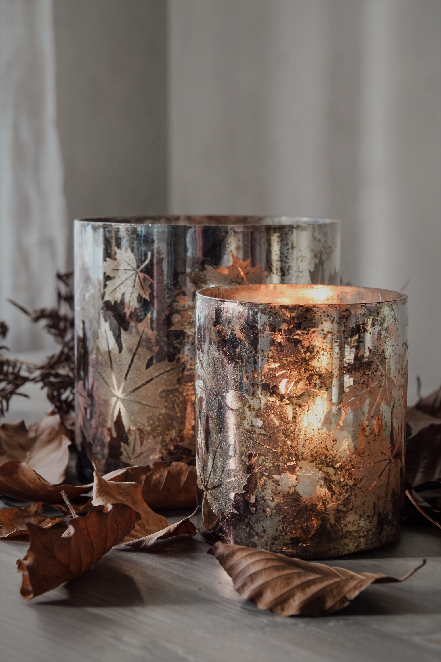 Vacker ljuslykta med höstlöv i en fin antikfinish, finns i flera storlekar. Från Majas Cottage. Läs mer
