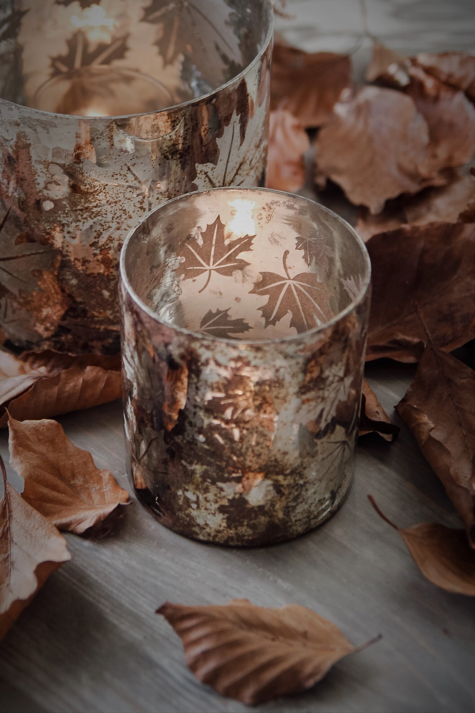 Vacker ljuslykta med höstlöv i en fin antikfinish, finns i flera storlekar. Från Majas Cottage.