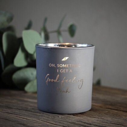 På framsidan av ljuslyktan finns en ingraverad text som lyder "Oh, sometimes I get a good feeling, yeah". Texten är skriven i en stil som kombinerar både stora och små bokstäver, vilket ger ett konstnärligt och inspirerande intryck. Den är genomsläpplig, vilket betyder att när ljuslyktan är tänd, belyser ljusets sken texten, vilket ger den ett vackert, glödande utseende.