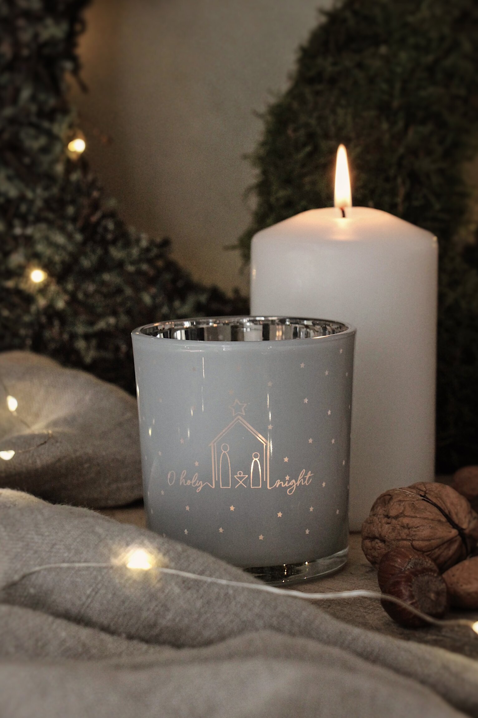 Underlaget består av en mjuk, grå textil som ger en känsla av komfort och värme. Denna mjuka bakgrund förstärker de varma tonerna i ljusen och bidrar till den övergripande lugnande atmosfären. På tyget ligger även några valnötter, lite slarvigt placerade, vilket ger en touch av naturlig enkelhet till bilden.