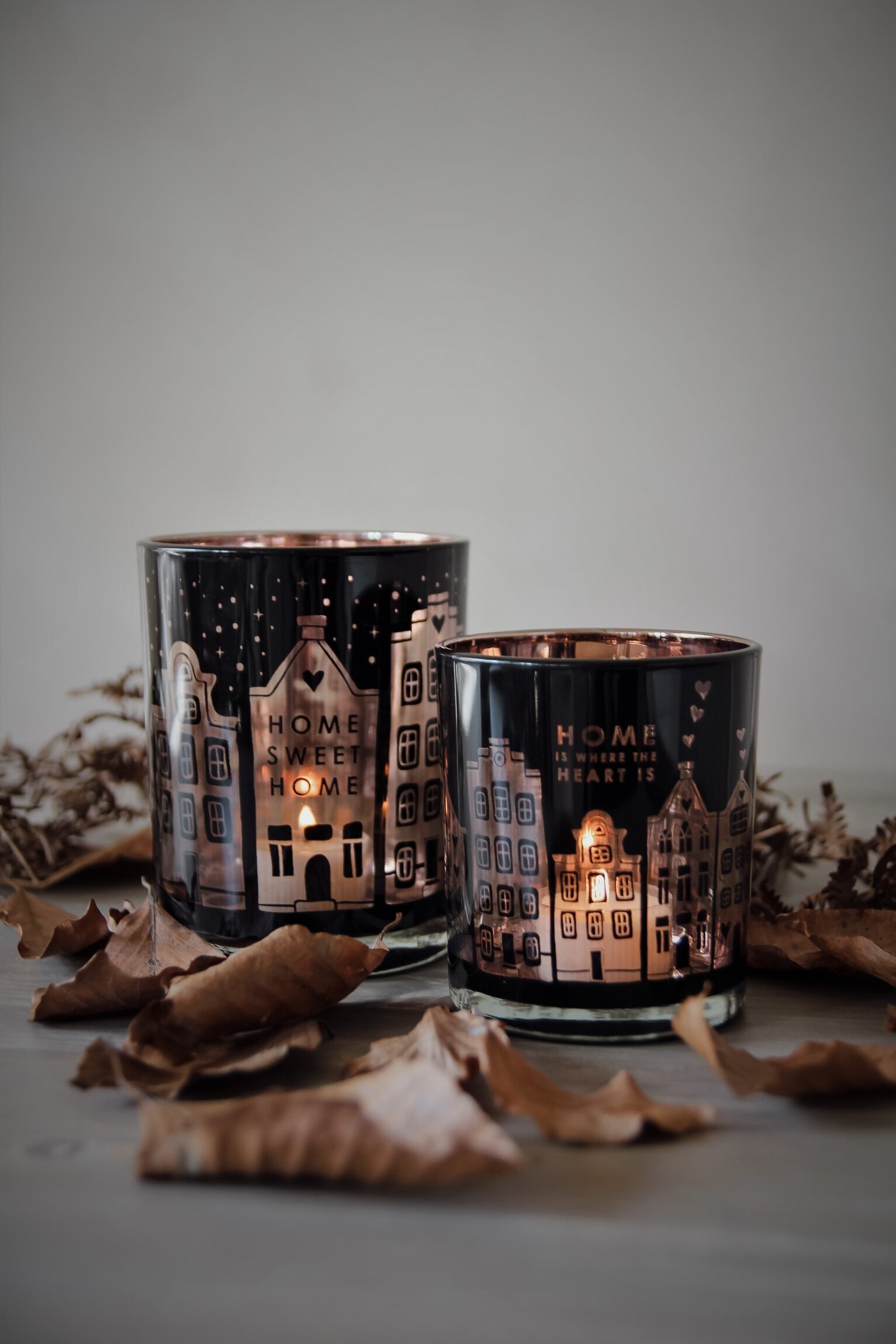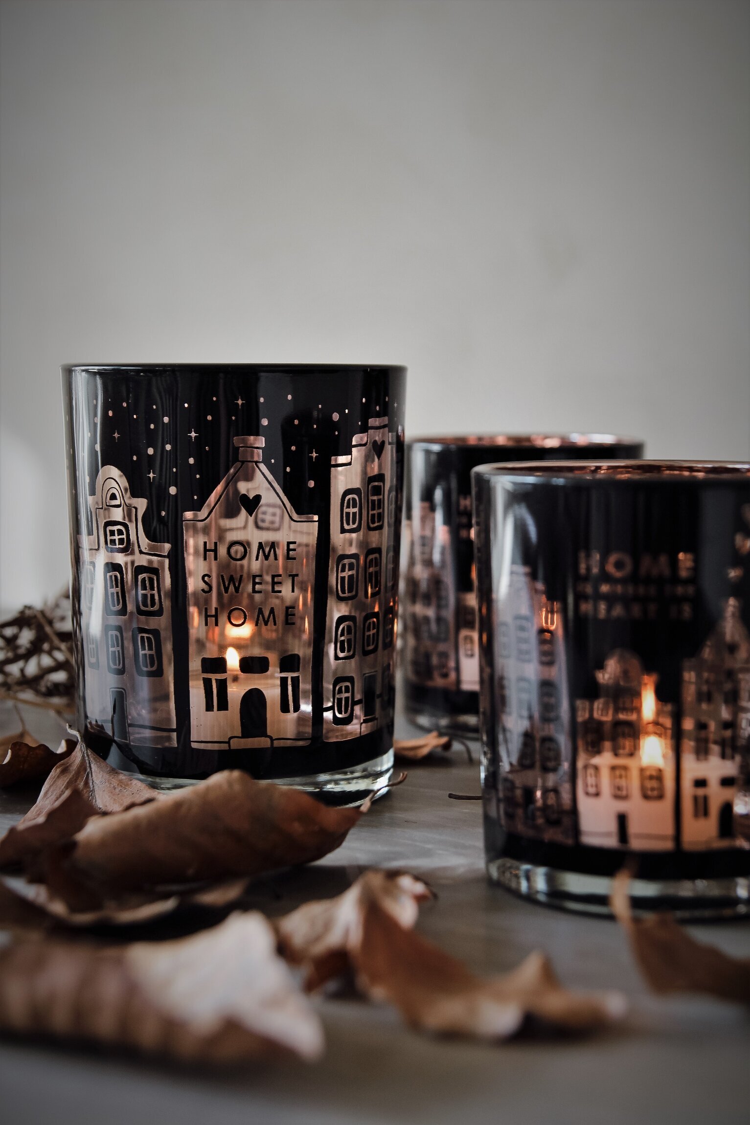 Vacker ljuslykta i en fin nyans av svart samt kopparfärgad insida. Motivet på ljuslyktan består av hus & stjärnhimmel.