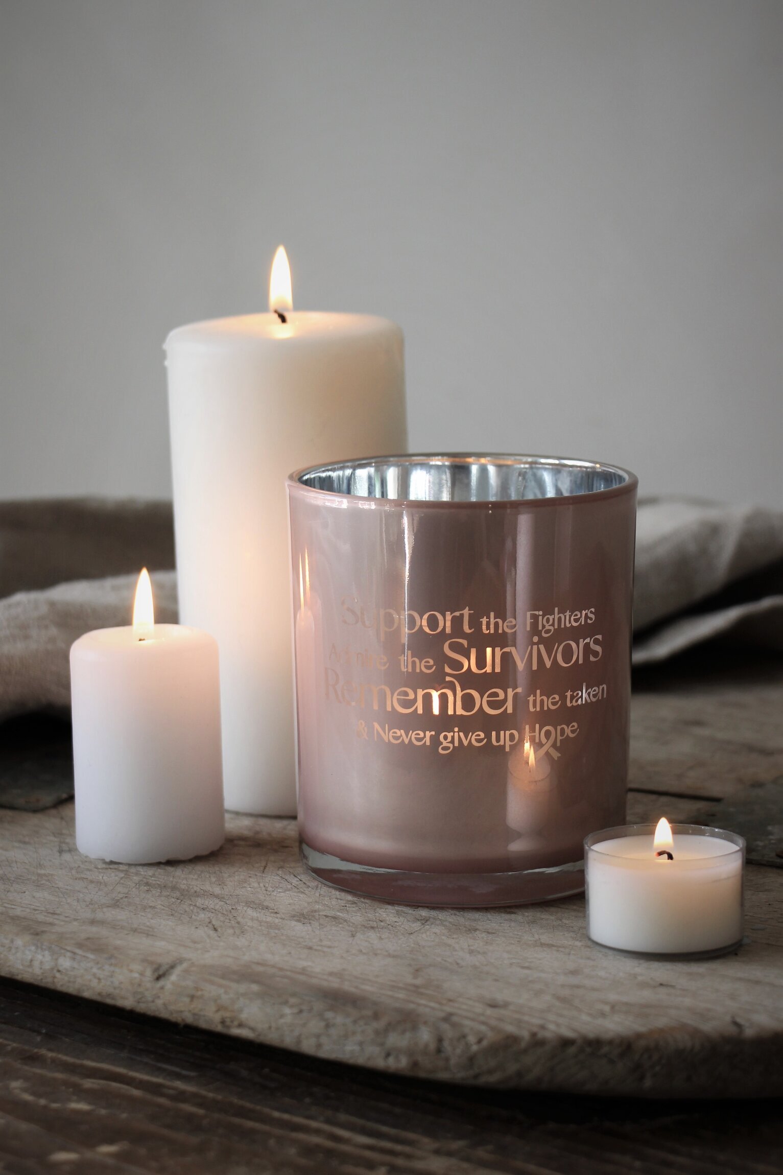 Bilden från Köpstaden.se visar en harmonisk komposition av ljusprodukter som skulle kunna förhöja atmosfären i vilket hem som helst. I centrum ser vi en vacker ljuslykta från Majas Cottage, specifikt modellerad för produkten Ljuslykta Hope Rosa Bandet. Lyktan är gjord av glas och har en subtil rosa ton som skapar en lugn och trivsam känsla. Den är placerad på ett rustikt träunderlag som förhöjer dess estetik med en naturlig och jordnära charm.