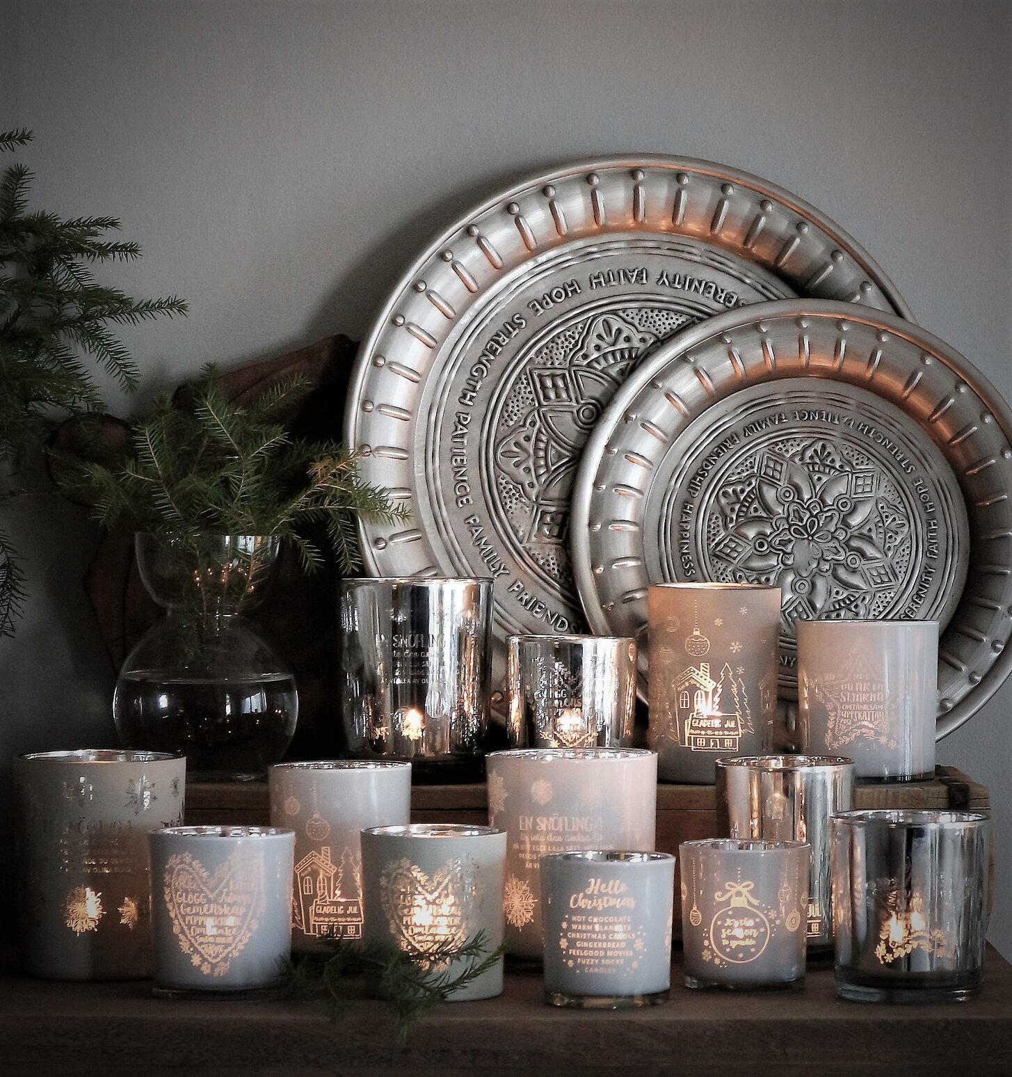 Runt lyktorna finns en elegant uppsättning av silverbrickor i varierande storlekar som lutar mot väggen. Dessa brickor har detaljerade, reliefmönster som ger dem en antik känsla, vilket kompletterar de varma tonerna från ljusen. Deras silvriga färg reflekterar ljuset och bidrar med en subtil glans som förstärker den festliga atmosfären.