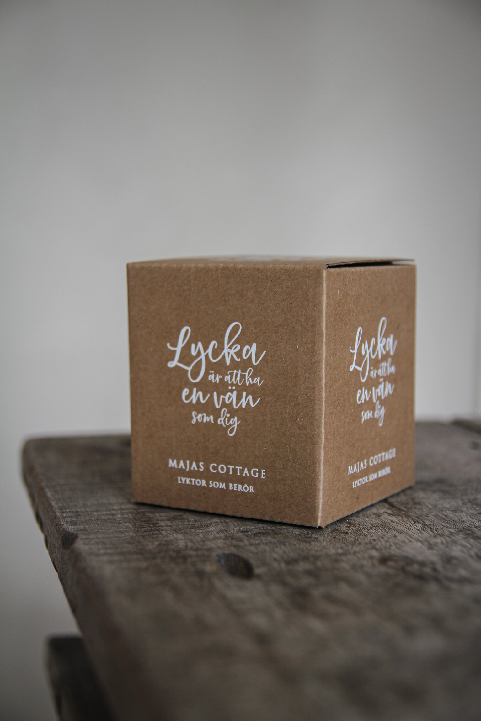 Vacker vit ljuslykta från Majas Cottage med text - Lycka är att ha en vän som dig. Läs mer