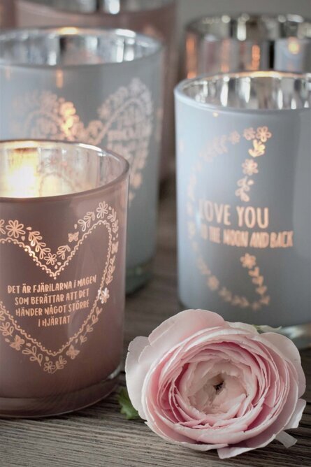 I bakgrunden kan vi urskilja ytterligare ljuslyktor i olika nyanser, inklusive en påtaglig brun lykta med ett hjärtmönster. Den bruna lyktan har en textrad med samma omsorgsfulla design, dock innesluten i ett hjärta, vilket förstärker den kärleksfulla och intima känslan i motivet. Texten på denna bruna lykta står på svenska och handlar om känslan av fjärilar i magen - en symbolik för glädje och hjärta.