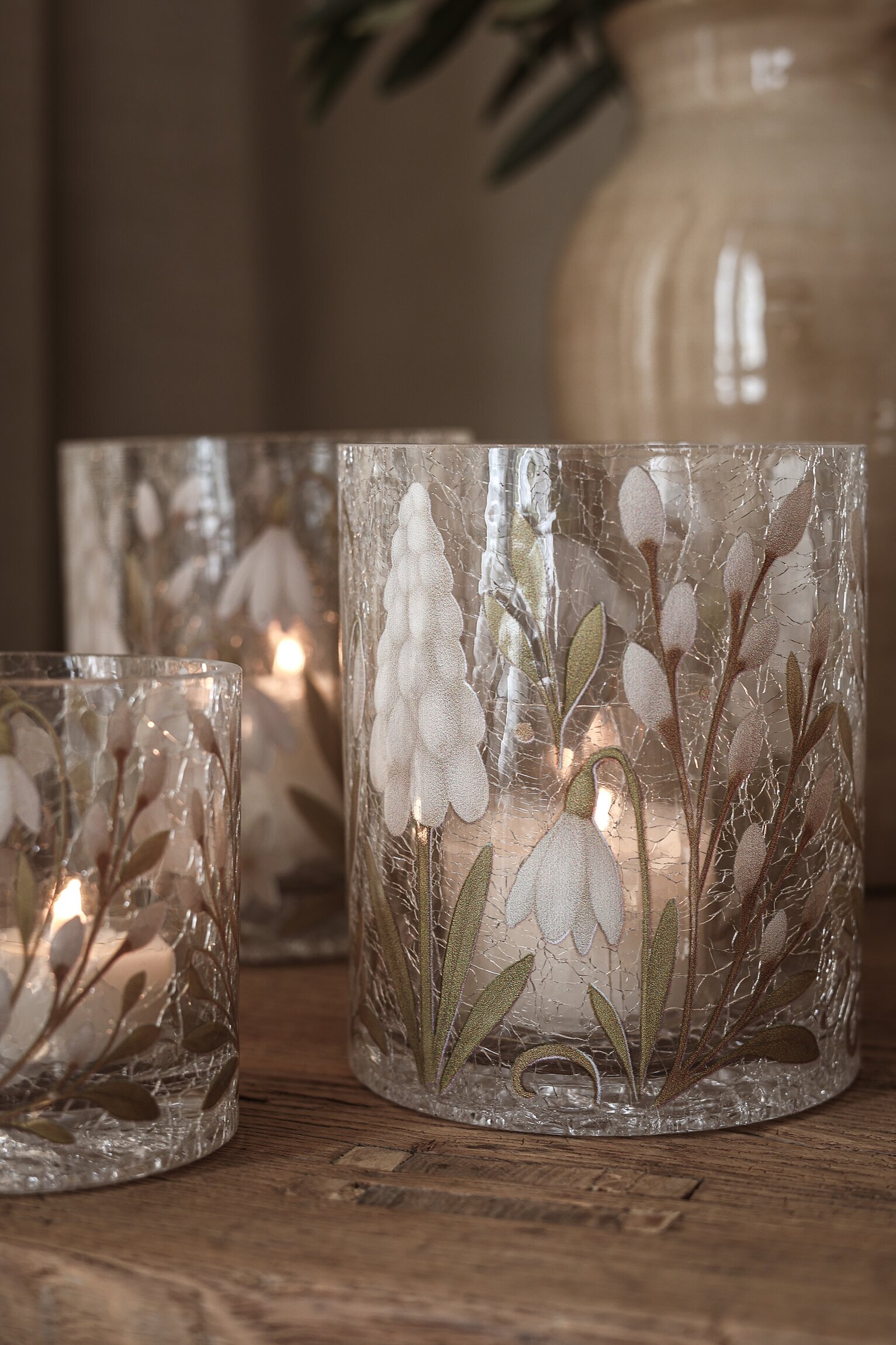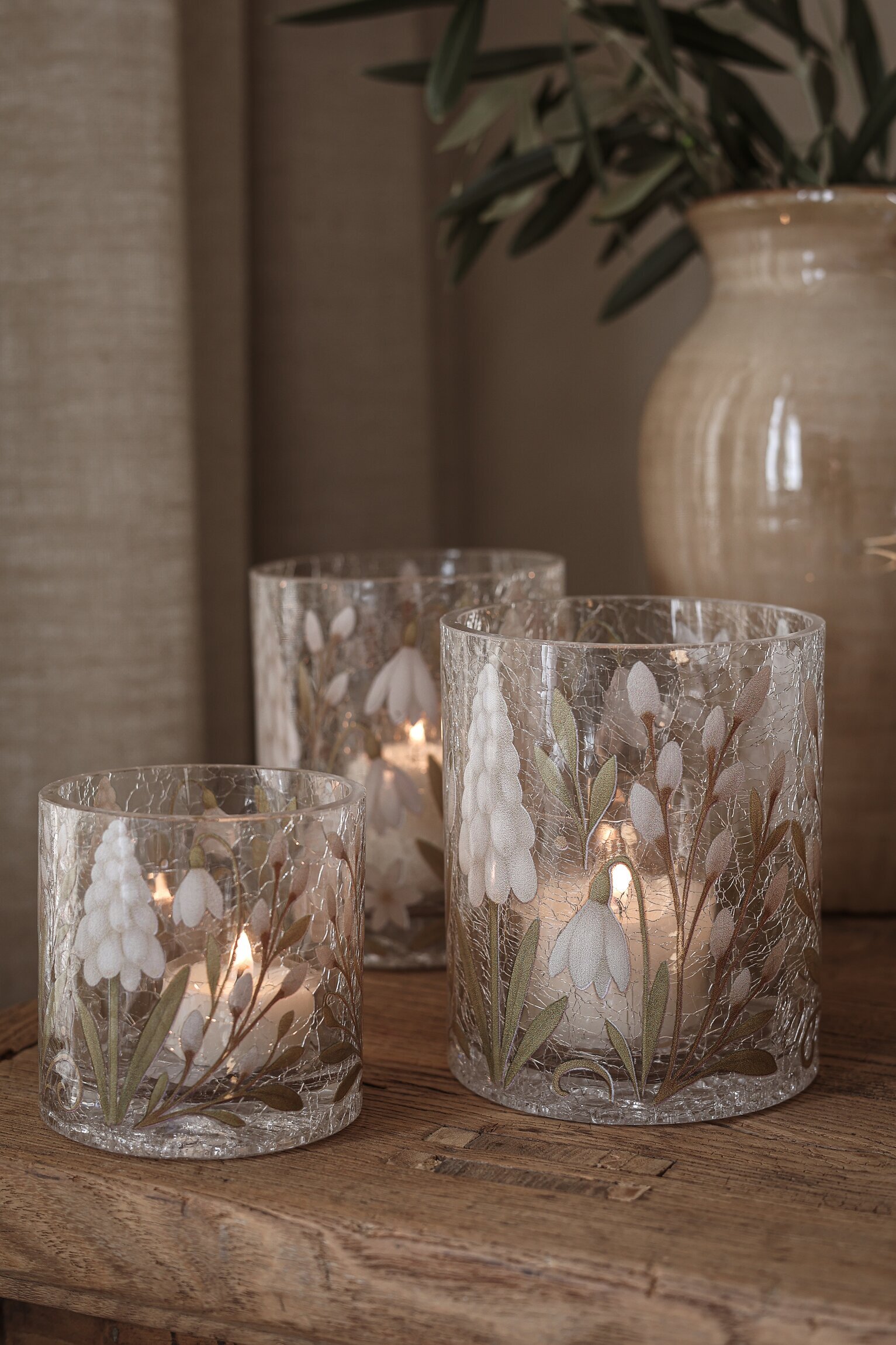 Vacker ljuslykta, handgjord i krackelerat glas och dekorerad med vackra pärlhyacinter, videkvistar och snöklockor. Läs mer