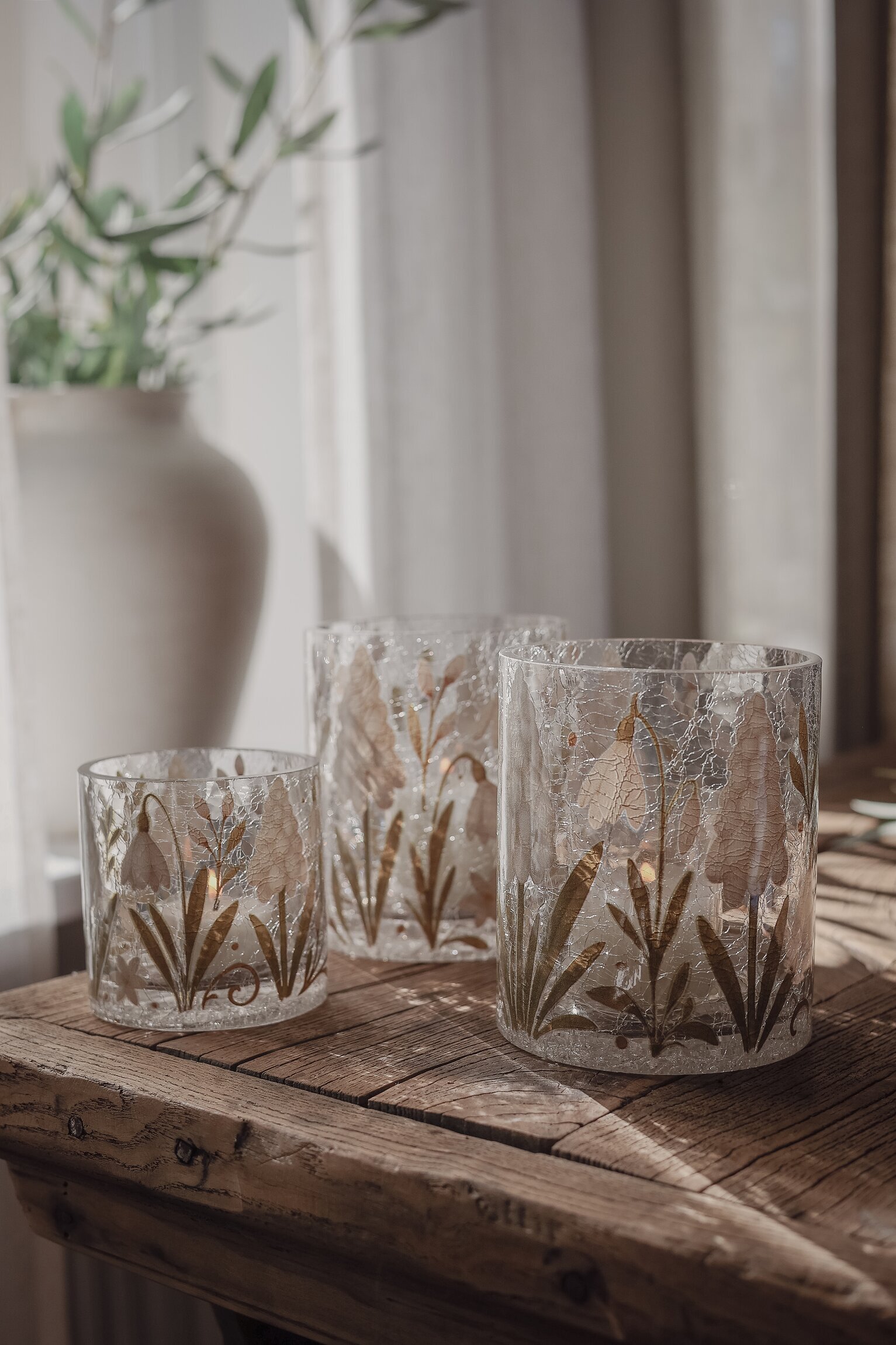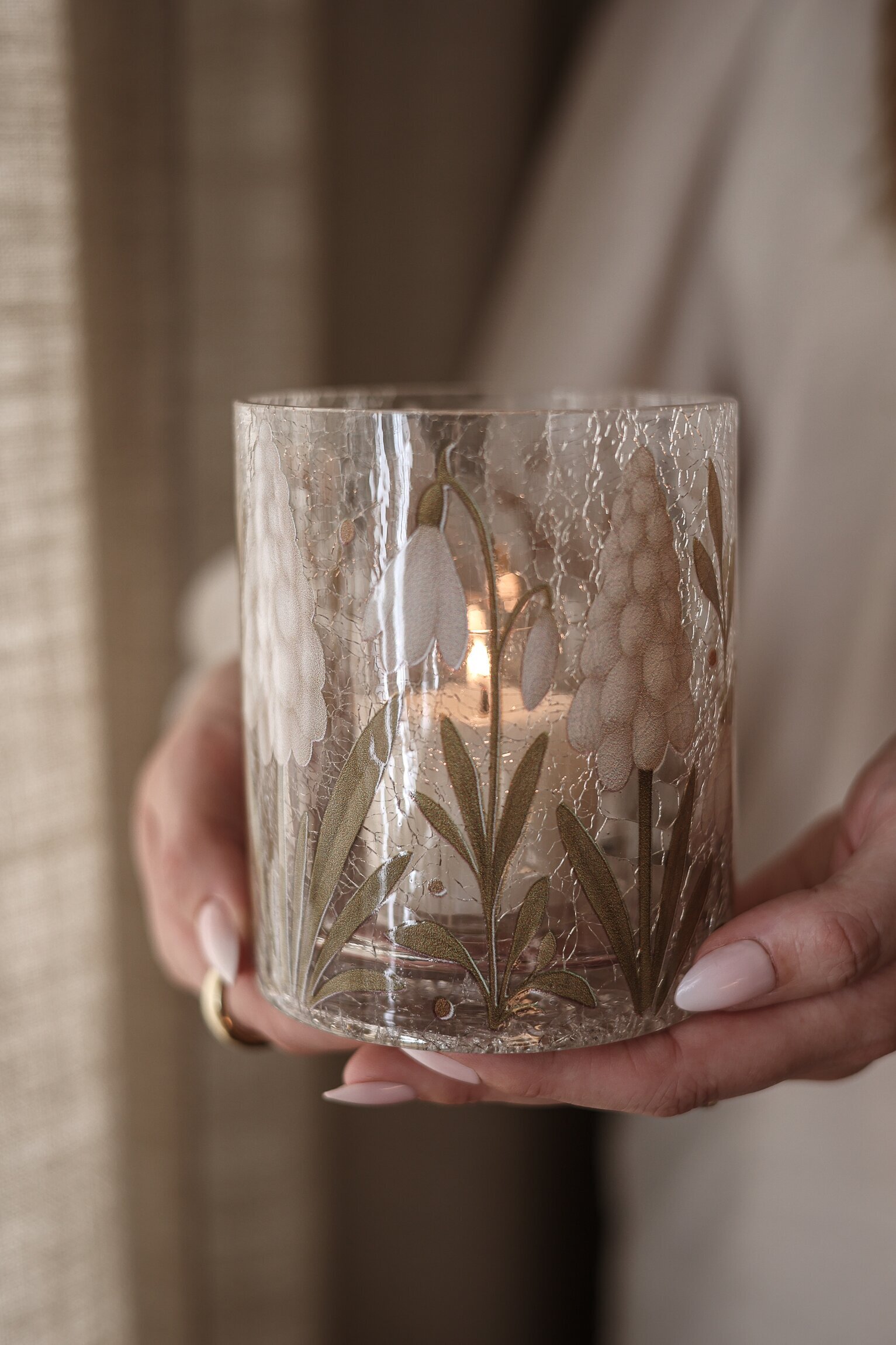 Vacker ljuslykta, handgjord i krackelerat glas och dekorerad med vackra pärlhyacinter, videkvistar och snöklockor. Varje lykta är unik, med små variationer i glasets tjocklek och sprickor, vilket ger en charmig och levande känsla.
