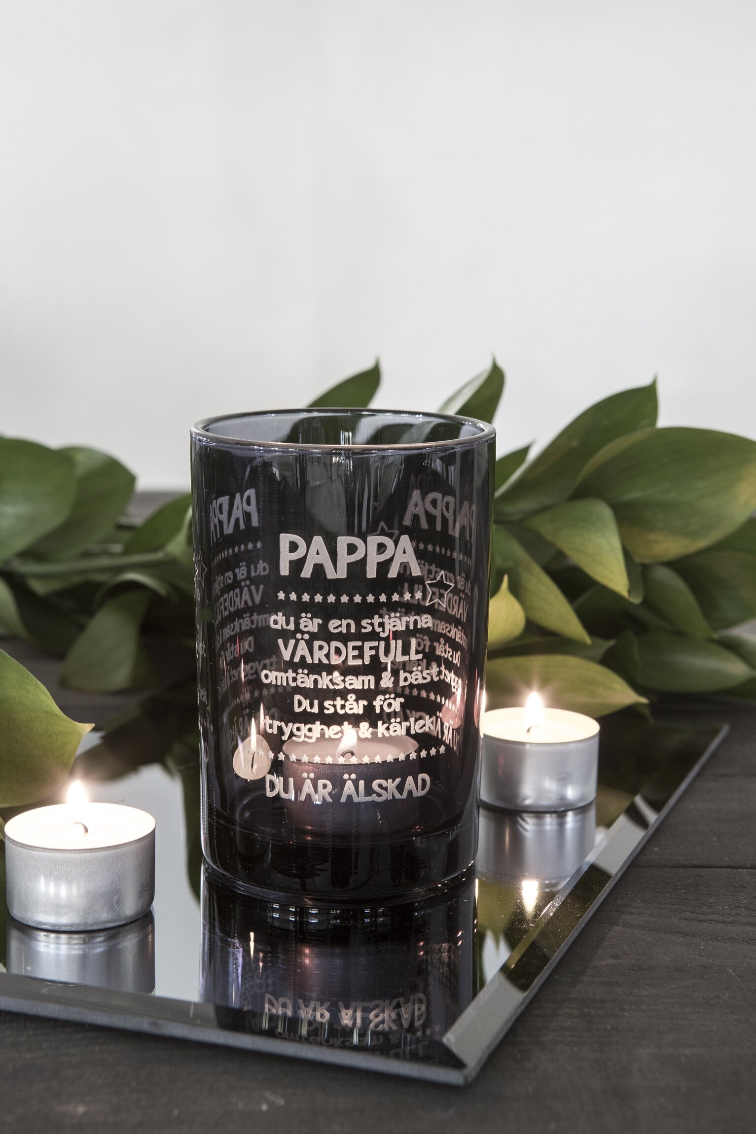 Ljuslyktan själv är tillverkad av ett blåtonat glas som skiftar i olika nyanser beroende på ljuset och vinkeln. Glasets ton ger produkten en distinkt karaktär och den text som är ingraverad på dess yta framträder tydligt. Orden "Pappa" och andra värdeord är ingraverade i ett vackert mönster runtom ljuslyktan. Dessa ord förstärker produktens betydelse som en känslosam och uppskattande present.
