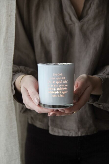 Ljuslyktan i sig har en enkel och stilren design, och är tillverkad av glas. Det finns en subtil text på framsidan av lyktan, vars ord är skrivna i en elegant, men samtidigt lättläst stil. Texten fångar uppmärksamheten genom sin gyllene ton som skimrar vackert mot den mjuka bakgrundens kontrast. Ljusets glöd skapar skuggor och ljusreflektioner i glaset, vilket förstärker en känsla av lugn och omtanke.
