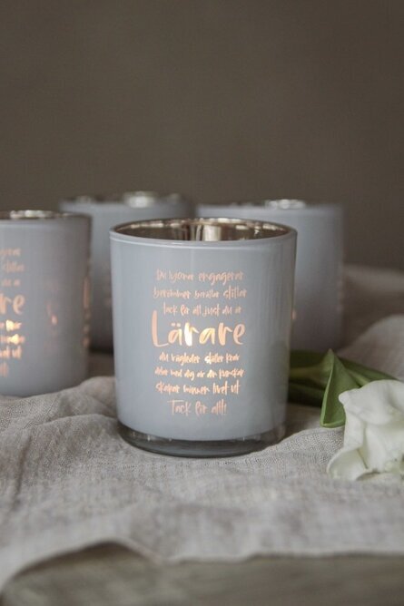 Vacker ljuslykta som blir en uppskattad present till skolavslutningen. Lyktan har en inspirationstext om lärare med en silverfärgad insida samt matt vit utsida.