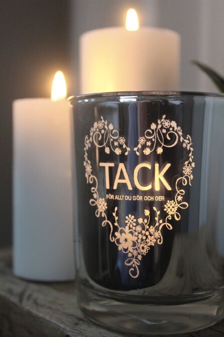 Ljuslyktan har ett subtilt mönster av blommor och blader som ramar in ordet "Tack". Ordet är stilrent och symmetriskt placerat mitt i hjärtat av designen. Under detta finns den tryckta texten "För allt du gör och ger", vilket förstärker budskapet av uppskattning och tacksamhet som produkten är avsedd att förmedla.