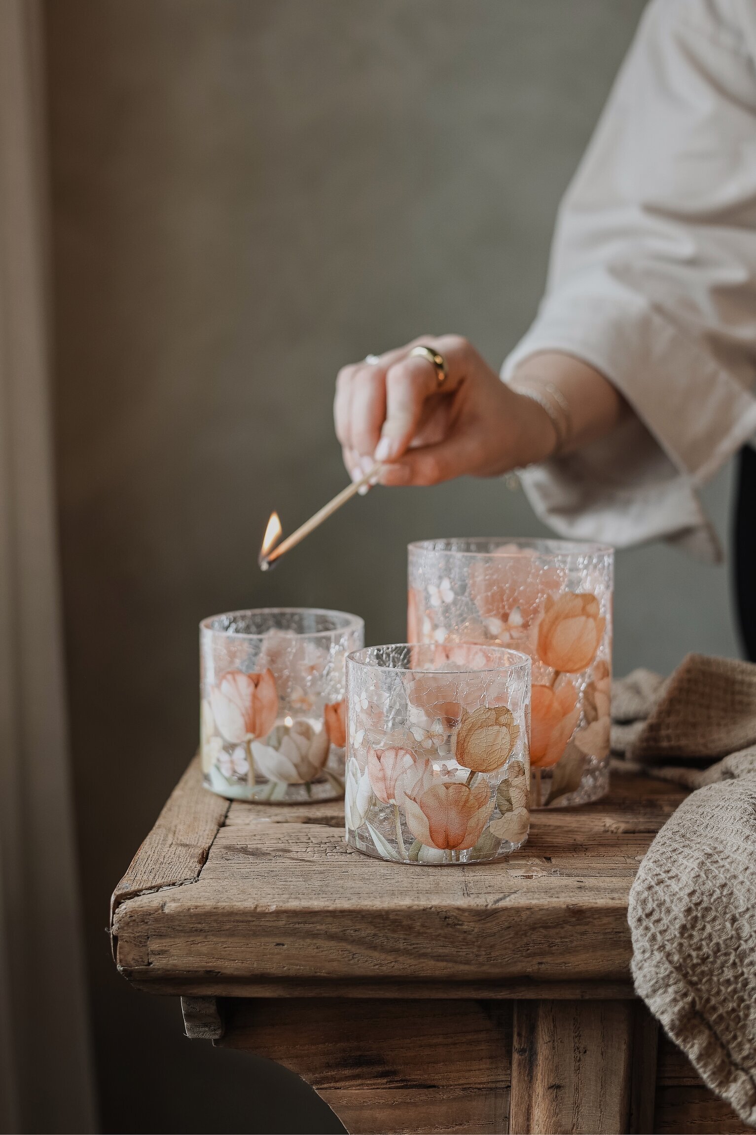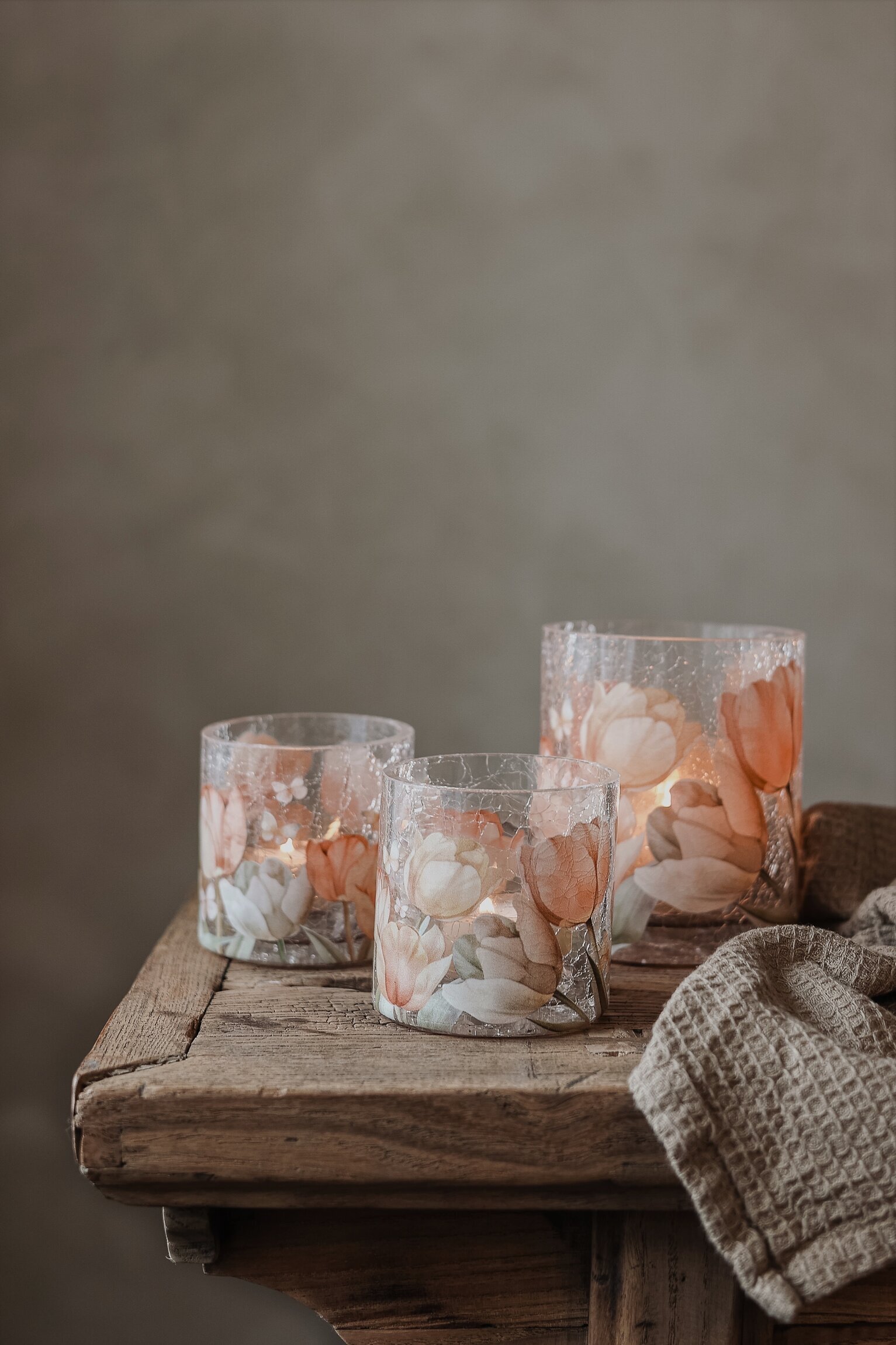 Vacker ljuslykta, handgjord i krackelerat glas och dekorerad med vackra tulpaner. Varje lykta är unik, med små variationer i glasets tjocklek och sprickor, vilket ger en charmig och levande känsla.