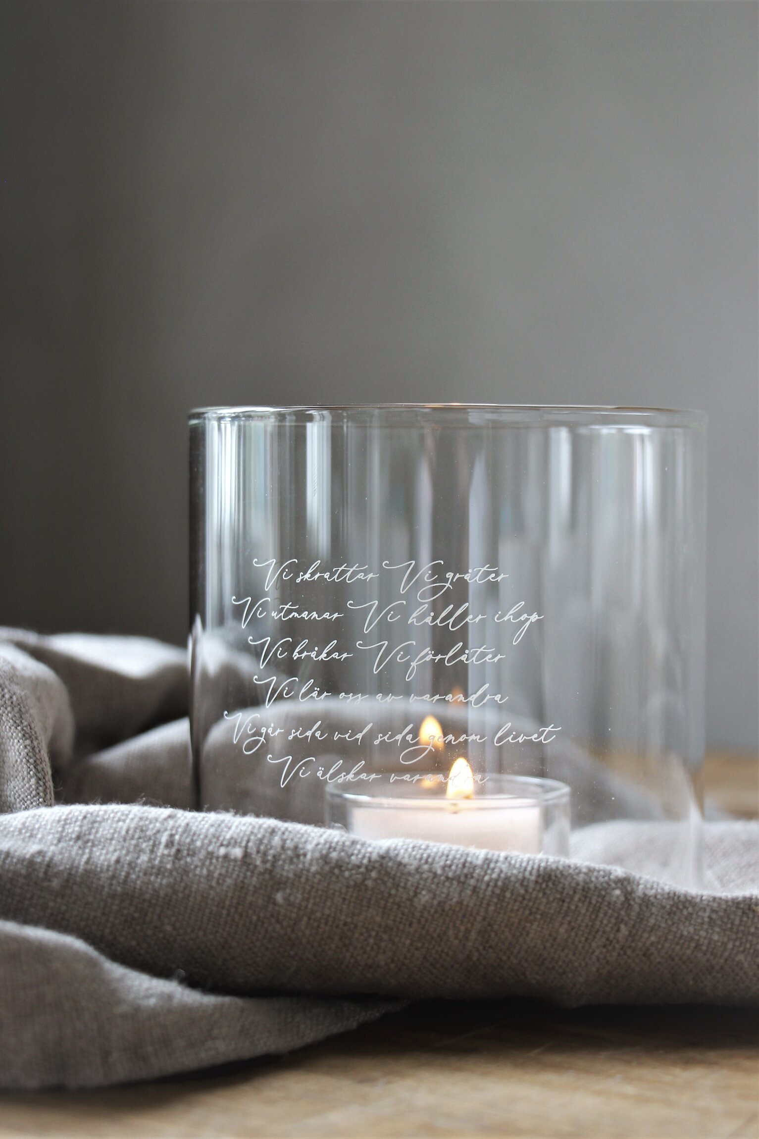 På glasets yta finns en dekorativ text ingraverad i vacker, snirklig stil. Orden är placerade vertikalt och skapar en balans och elegans i designen, vilket förhöjer lyktans visuella intryck. Textens placering och typografi bidrar till lyktans unika karaktär och gör den till mer än bara en funktionell ljushållare; den blir snarare en symbol för ljus och värme.