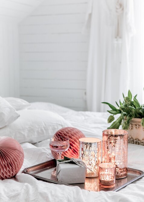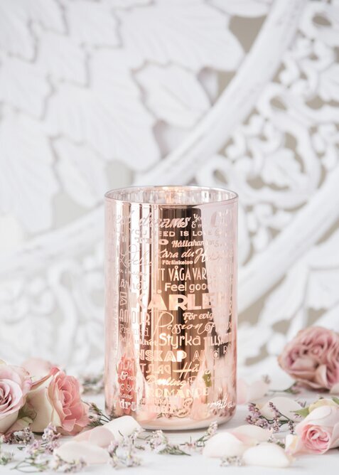 Vacker ljuslykta med ord & meningar om KÄRLEK . Lyktan har en roséfärgad finish samt silvrig insida. Läs mer