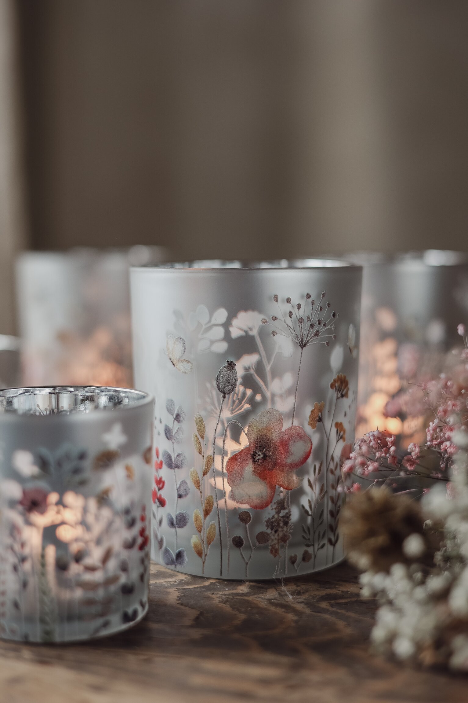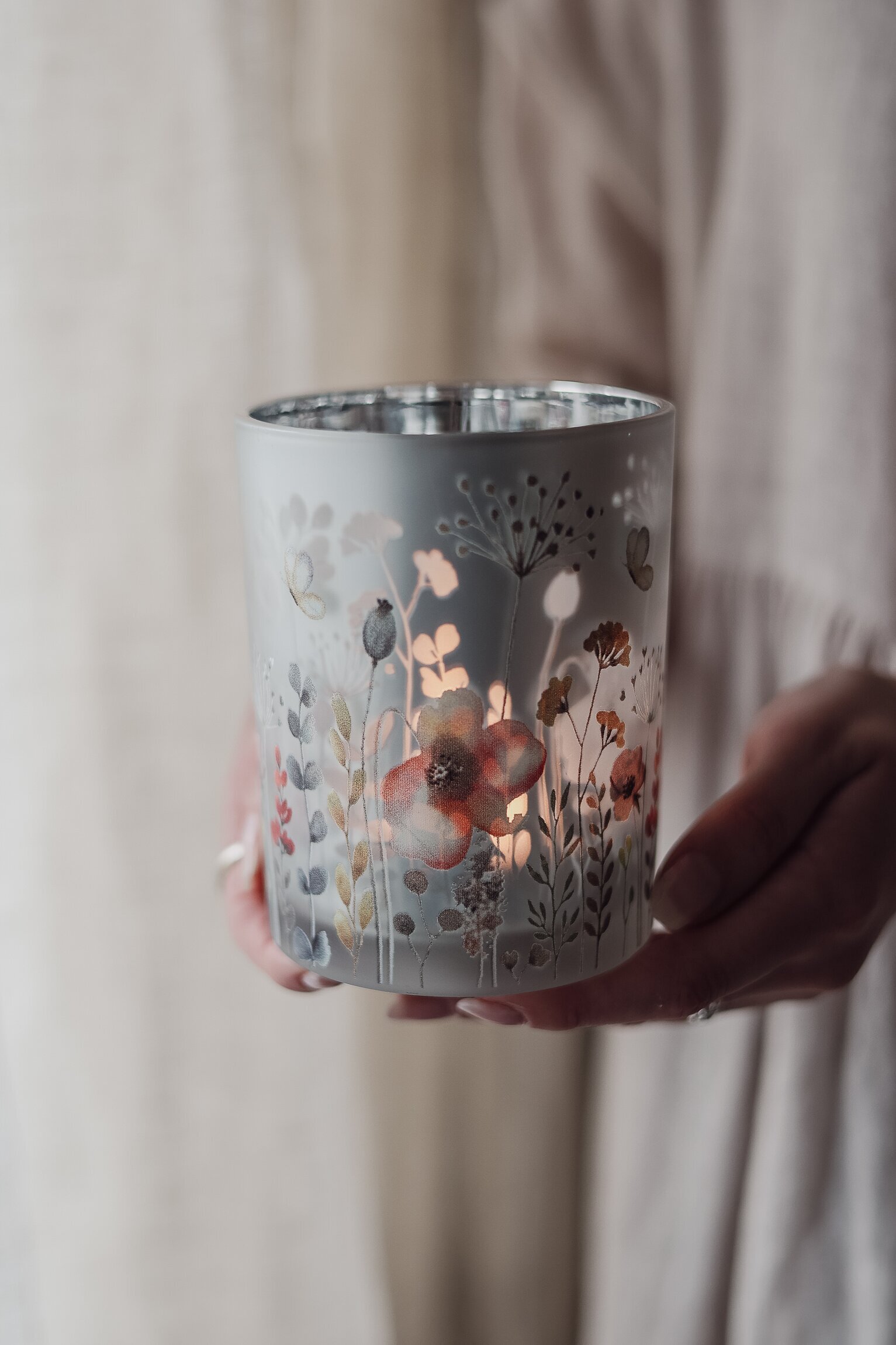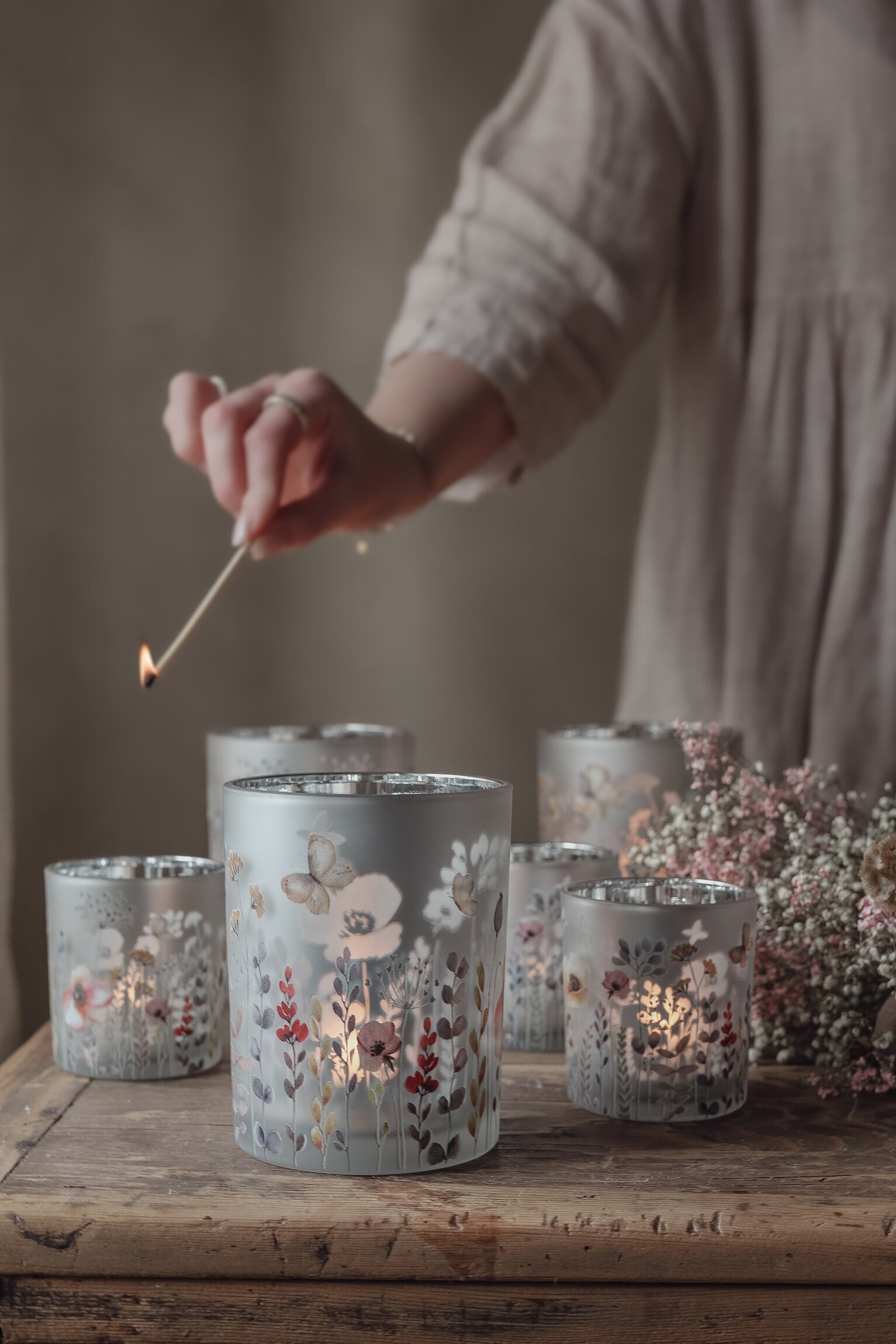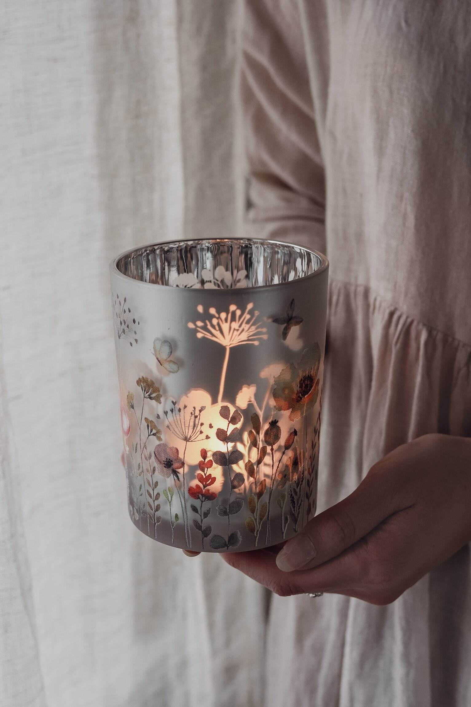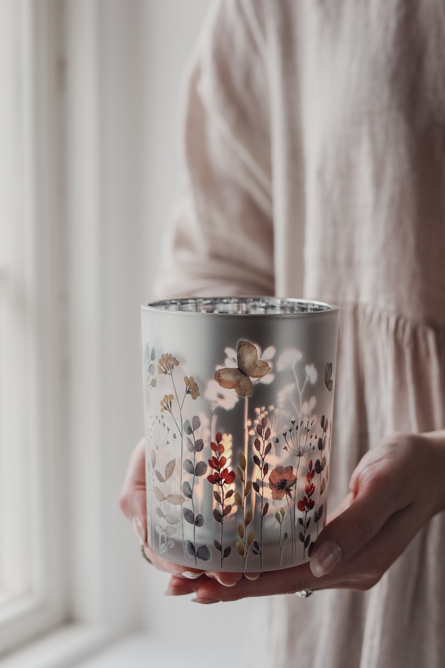 Med sina vackra blommor, fjärilar och skimrande silverinsida skapar den ett varmt och levande sken – perfekt för att höja stämningen i vardagsrummet, på matbordet eller i uterummet.