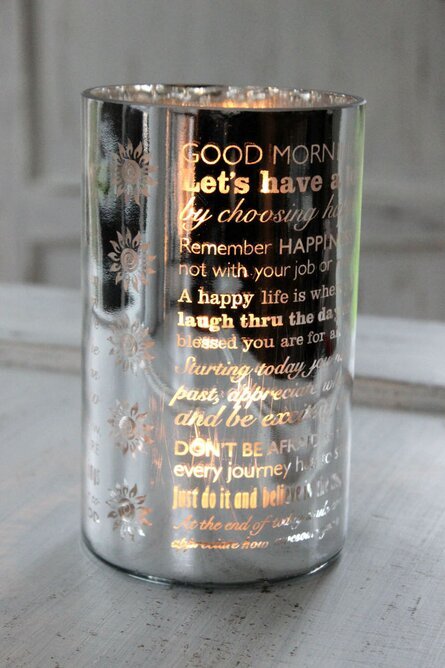 Glaset är dekorerat med en kombination av text och blommönster. Texten, som är ingraverad i glaset, består av inspirerande och uppmuntrande ord och fraser, vilket bidrar till lykts känsla av trivsamhet och lugn. Orden är placerade i ett varierat typsnitt vilket ger en dynamisk och intressant visuell effekt. Blommönstret, som också är ingraverat, bryts elegant runt texten, vilket kompletterar det övergripande utseendet och skapar en harmonisk balans mellan orden och det dekorativa.