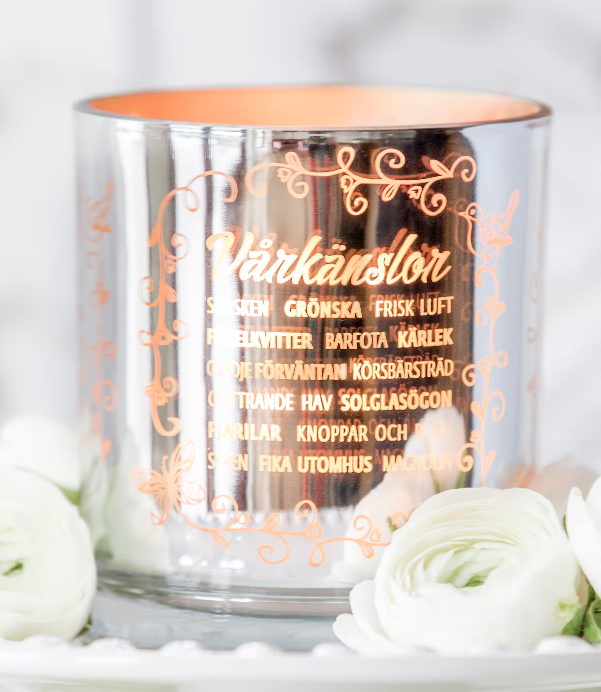 Texten på lyktan är i en varm, kopparliknande färg som skapar en subtil kontrast mot den blanka bakgrunden. Orden på lyktan ger associationer till vårens skönhet och känslor, med ord som "solsken", "grönska" och "frisk luft" utskrivna i en mjuk och inbjudande stil. Dekorativa krusiduller och blommiga motiv omger texten och tillför en extra dimension av detaljarbete.
