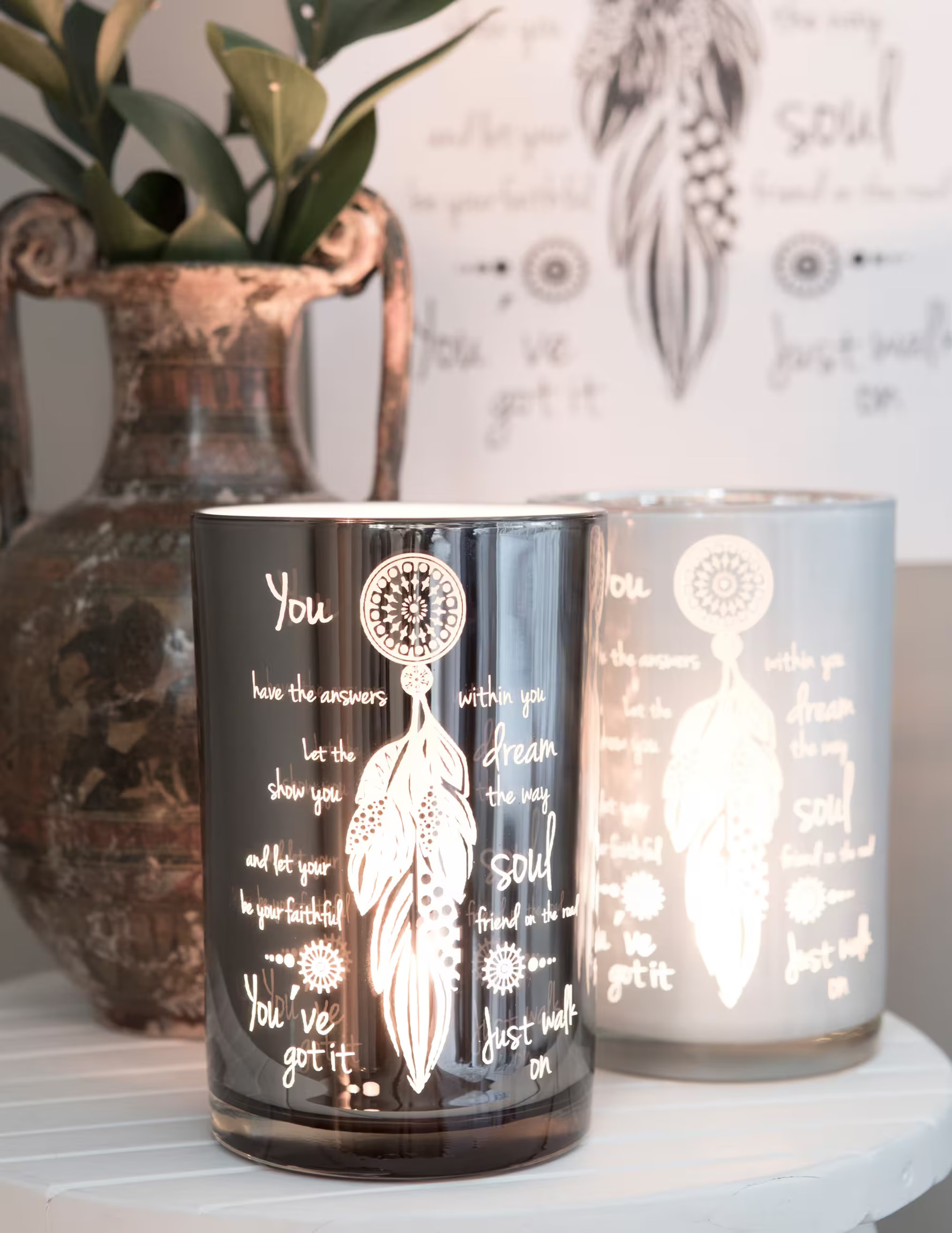 Vacker ljuslykta från Majas Cottage med silvrig insida samt matt vit utsida. Text: Walk on.