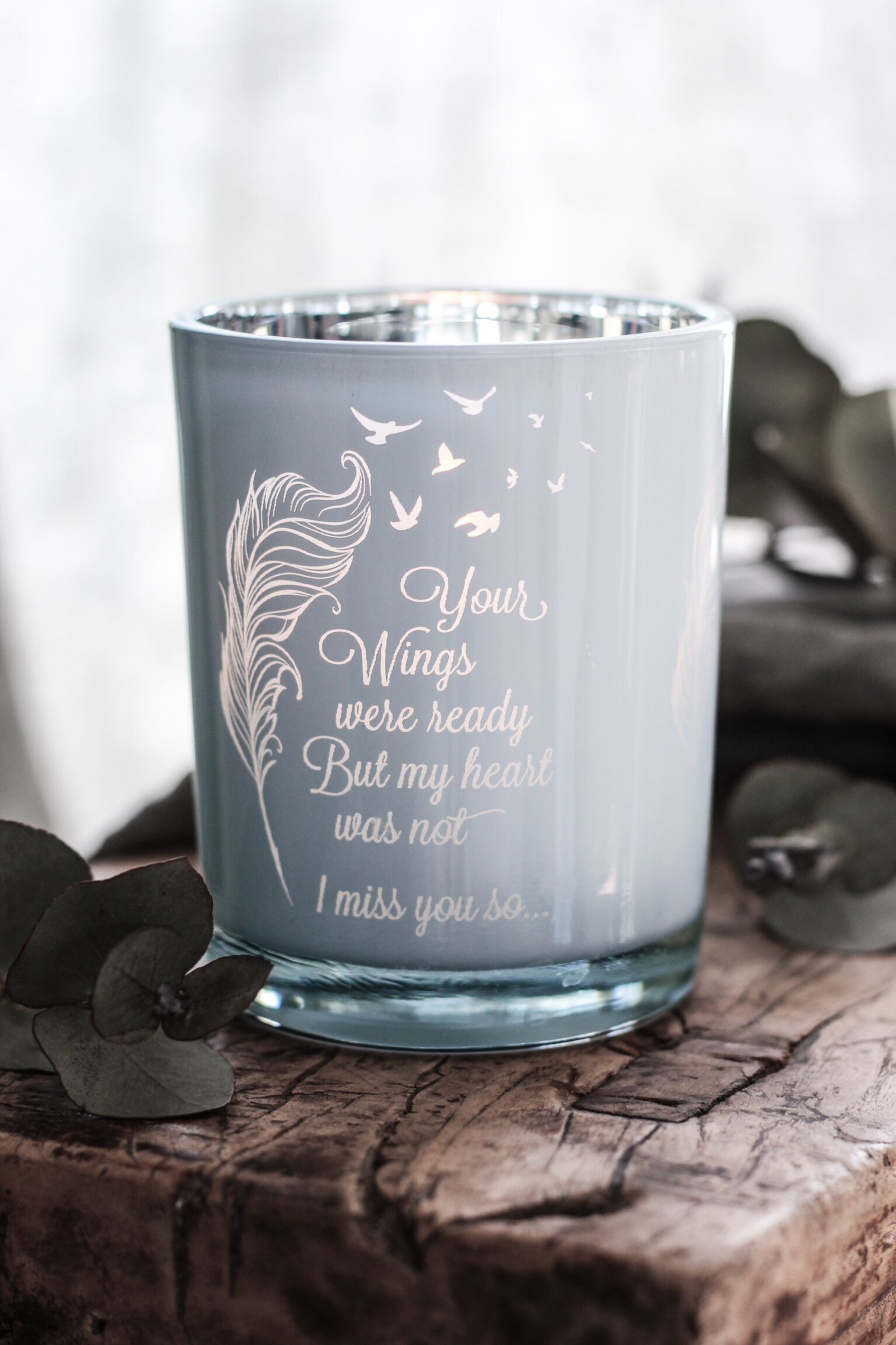 Ljuslykta med vacker text om saknaden av de nära & kära - Your wings were ready but my heart was not, I miss you so...