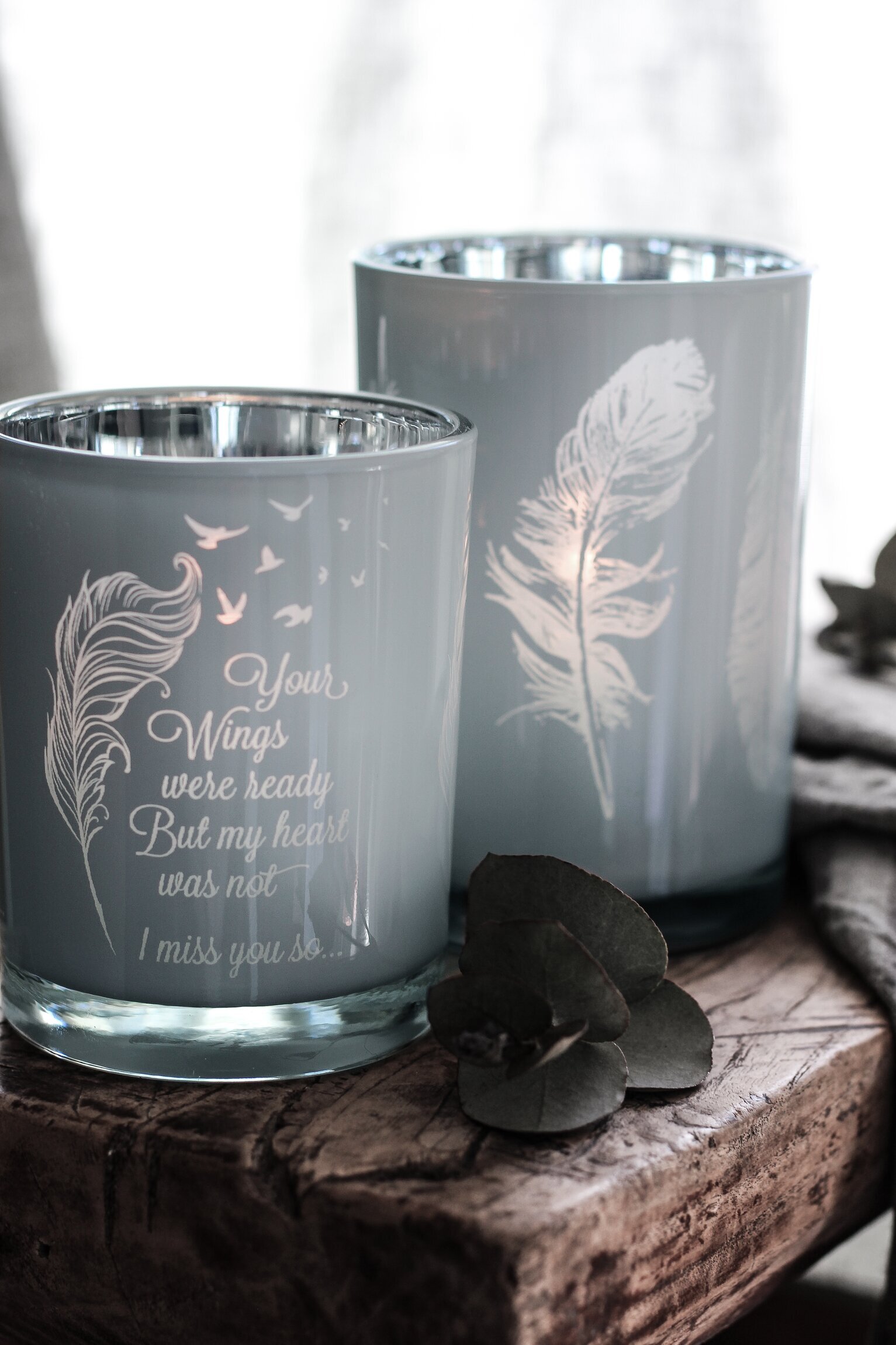 Ljuslykta med vacker text om saknaden av de nära & kära - Your wings were ready but my heart was not, I miss you so. . . Mått: 8 x 10 cm. Läs mer