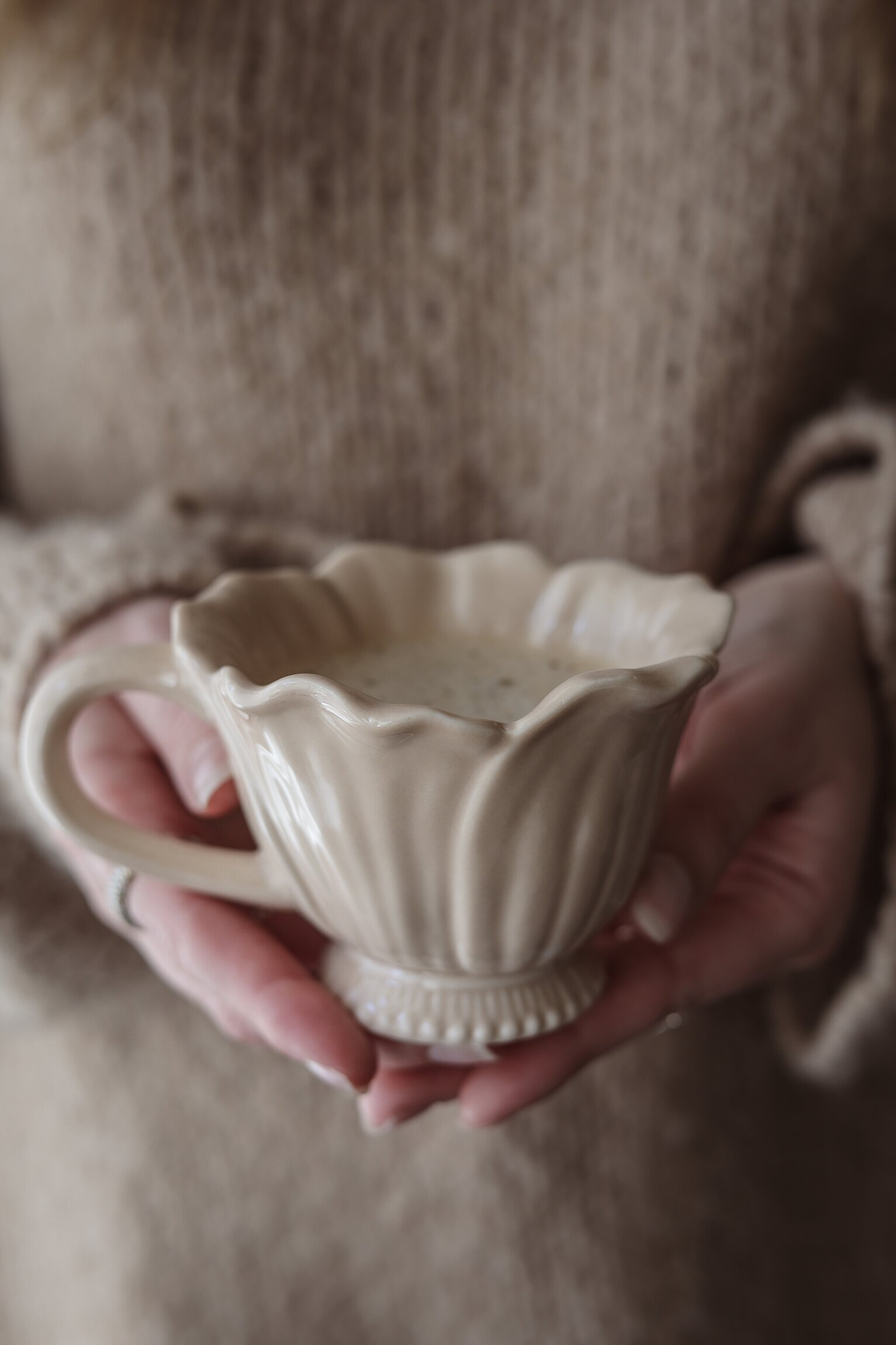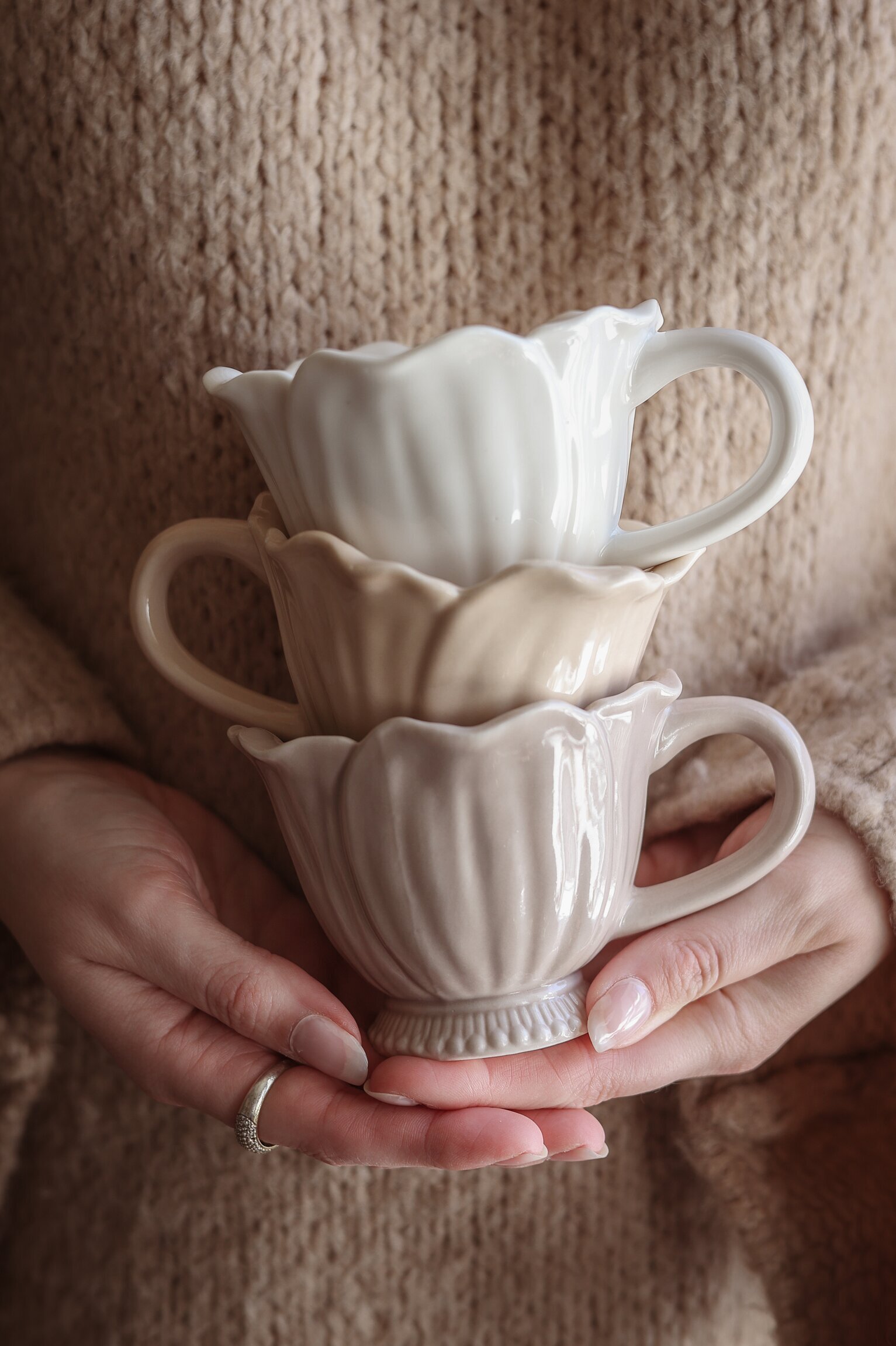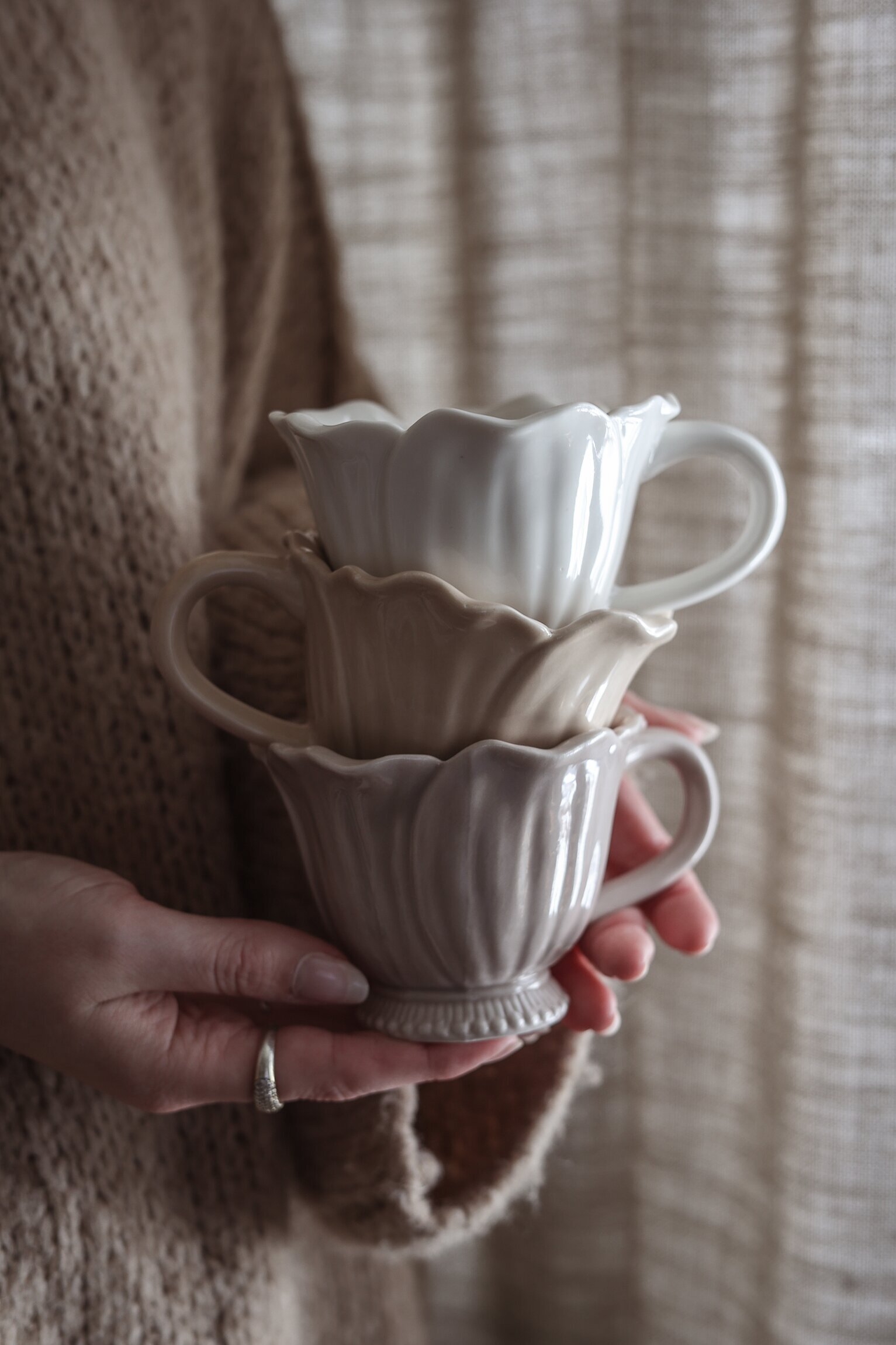 Blomstra-muggarna är ljuvliga skapelser i keramik, formade med inspiration från naturens egna blomblad. Varje mugg har en levande känsla och unika detaljer som förvandlar det dukade bordet till något alldeles extra.