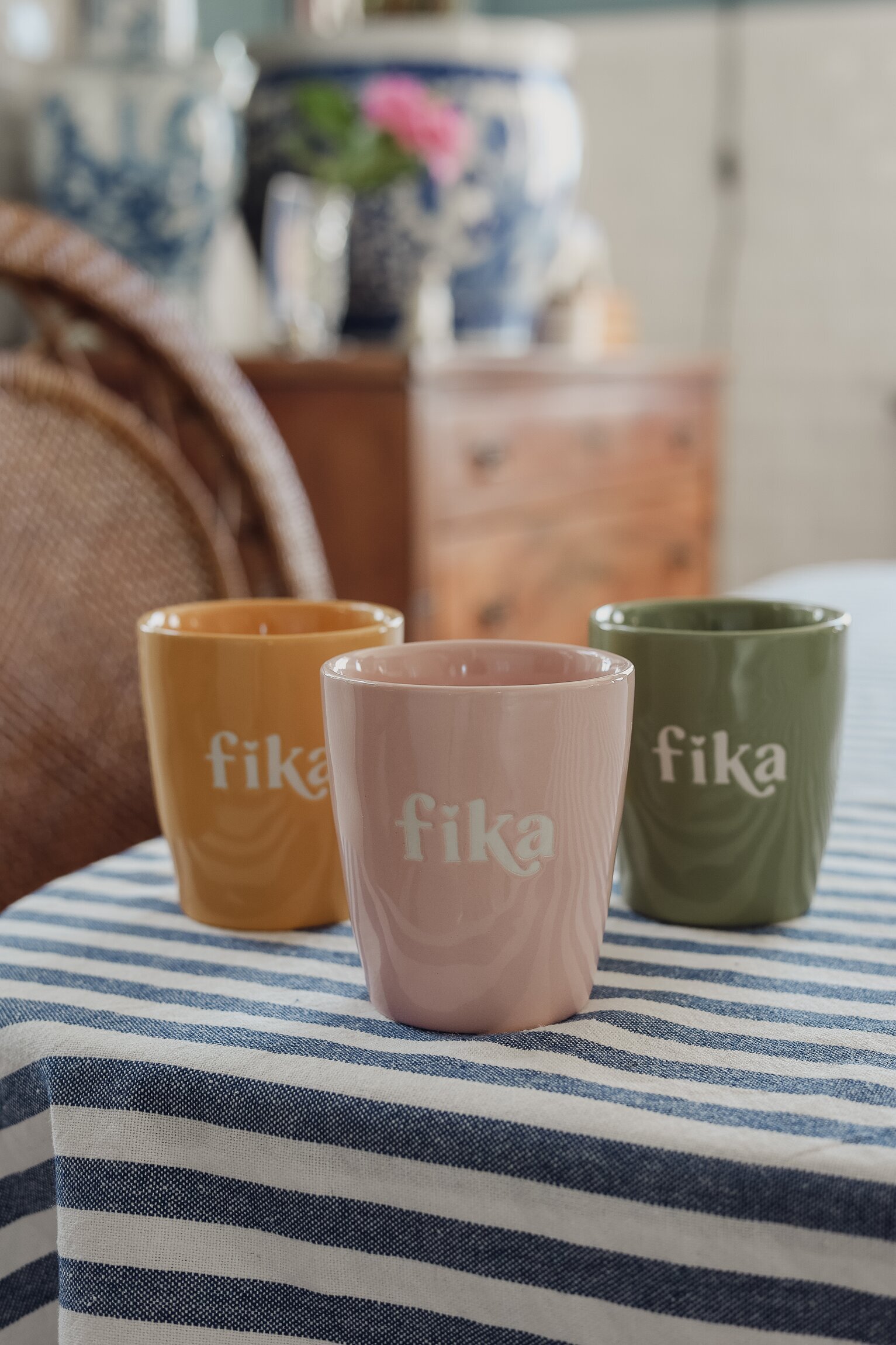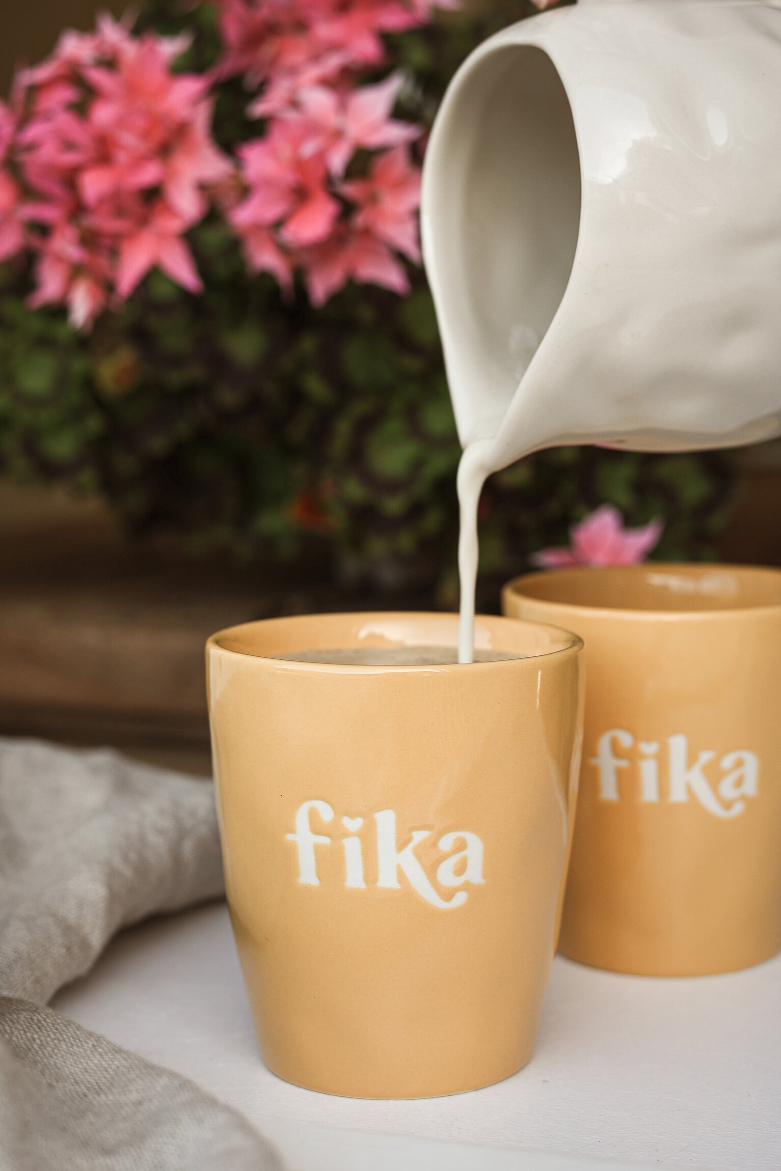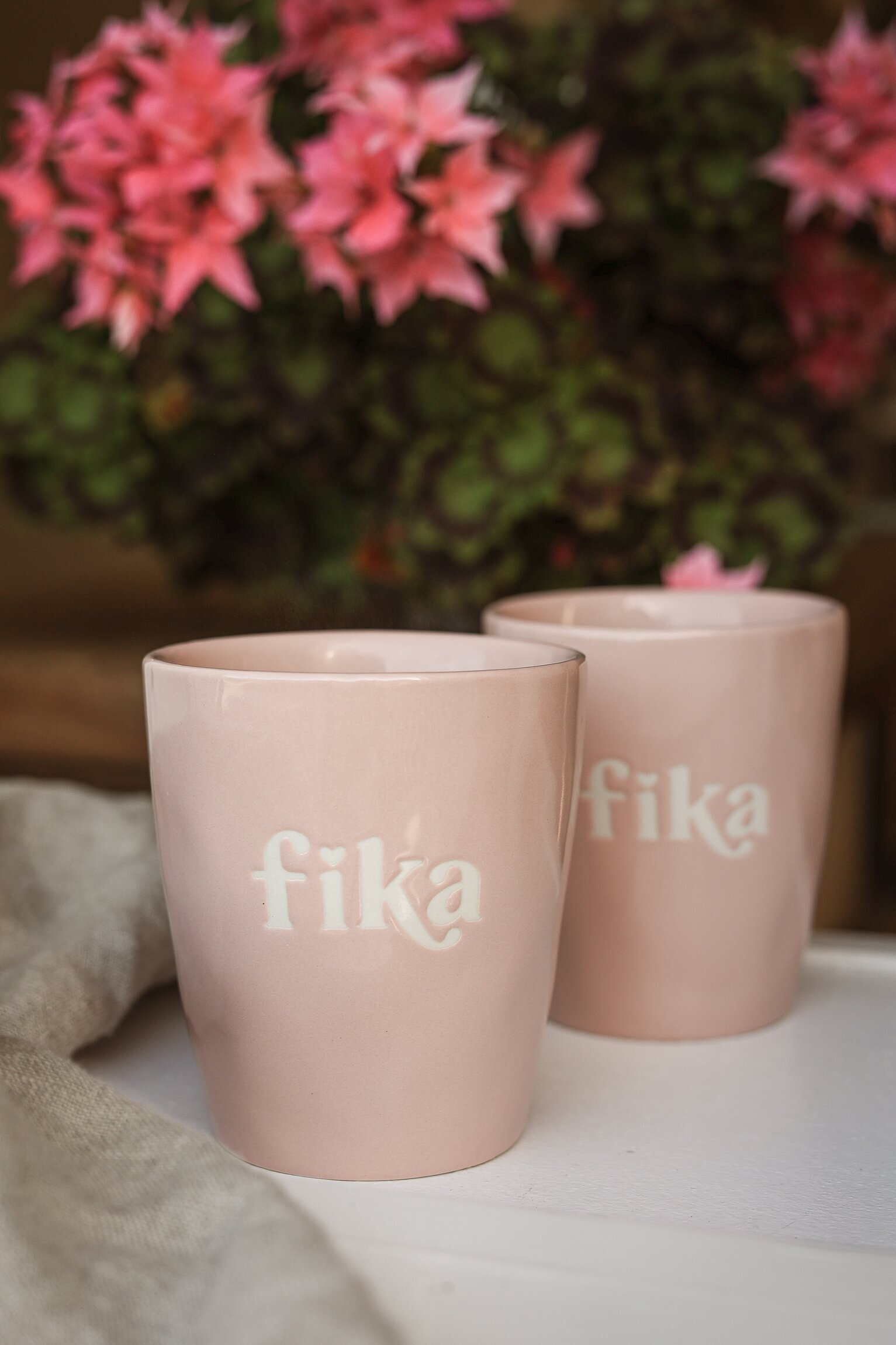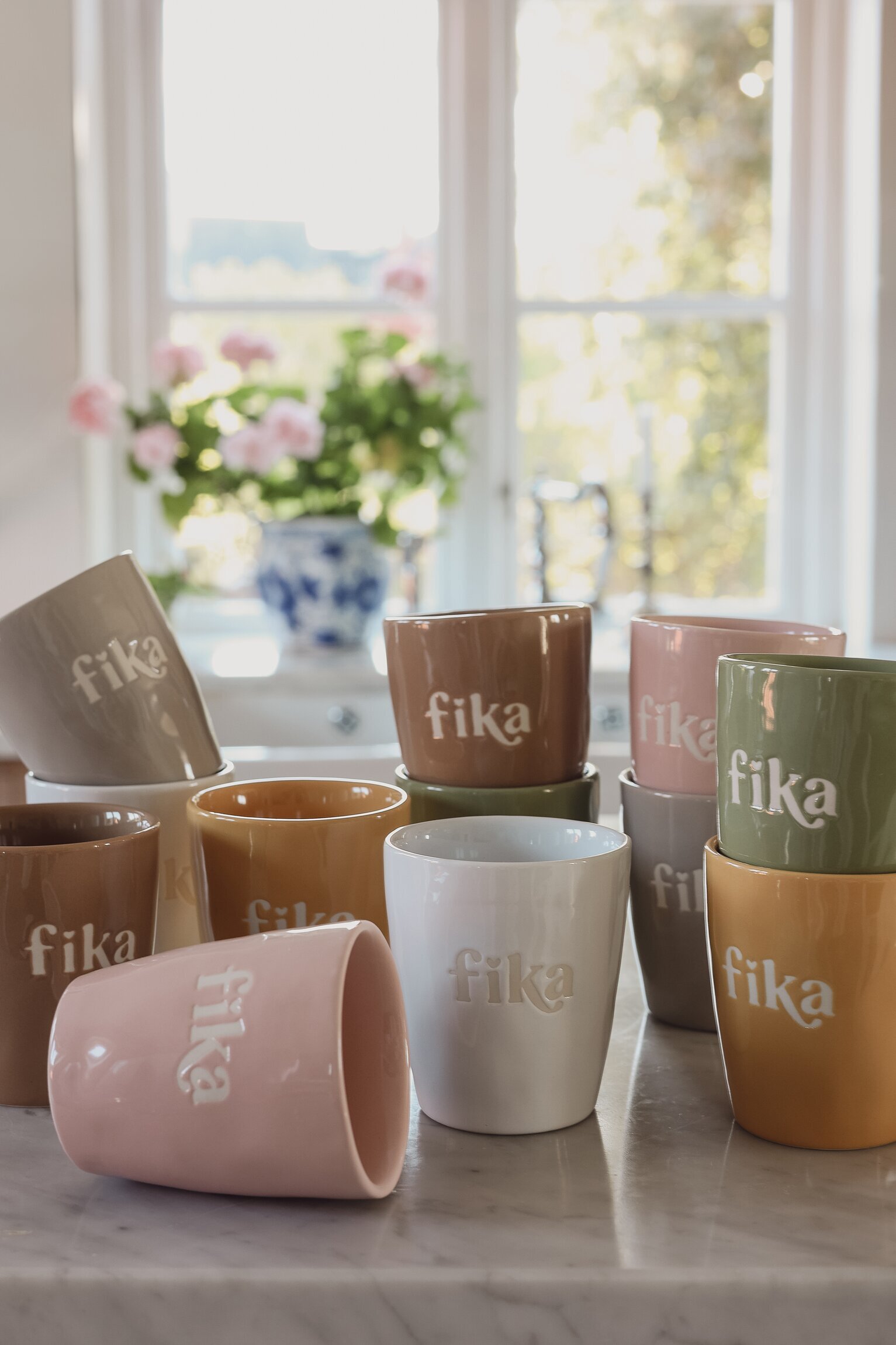 Majas muggar med texten Fika sprider värme i vardagen, de finns i flera fina färger och har en stilren silkscreen-text direkt i keramiken. Läs mer