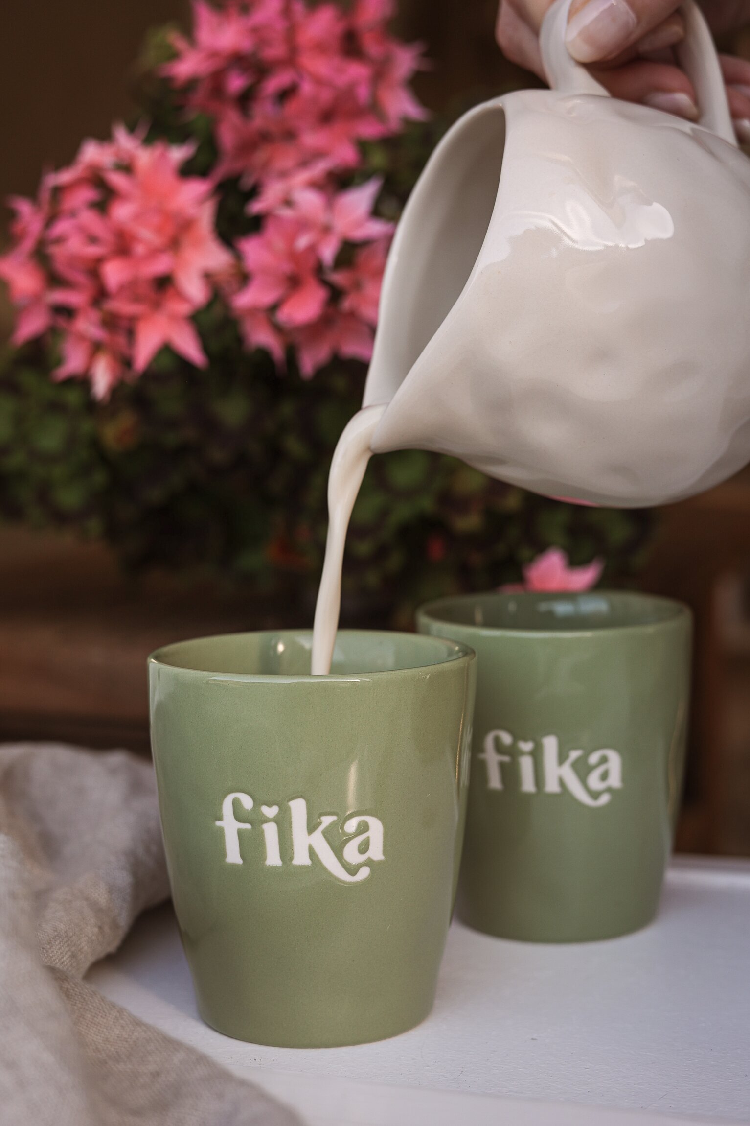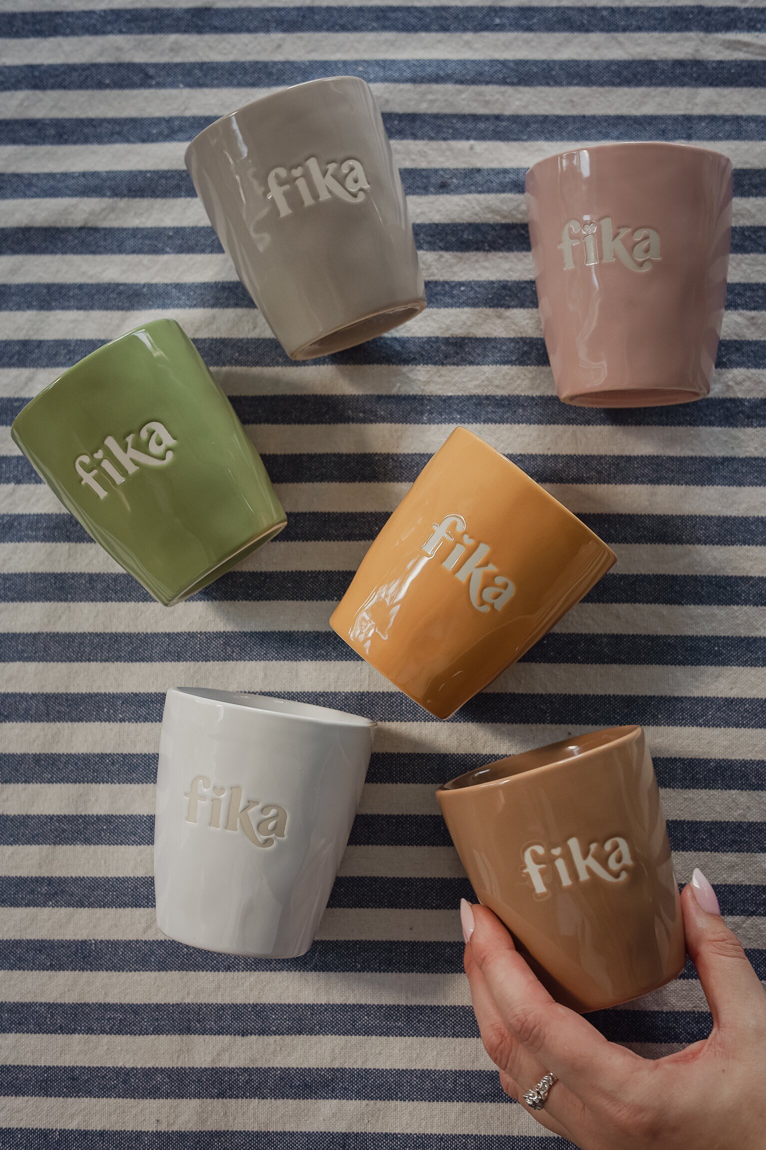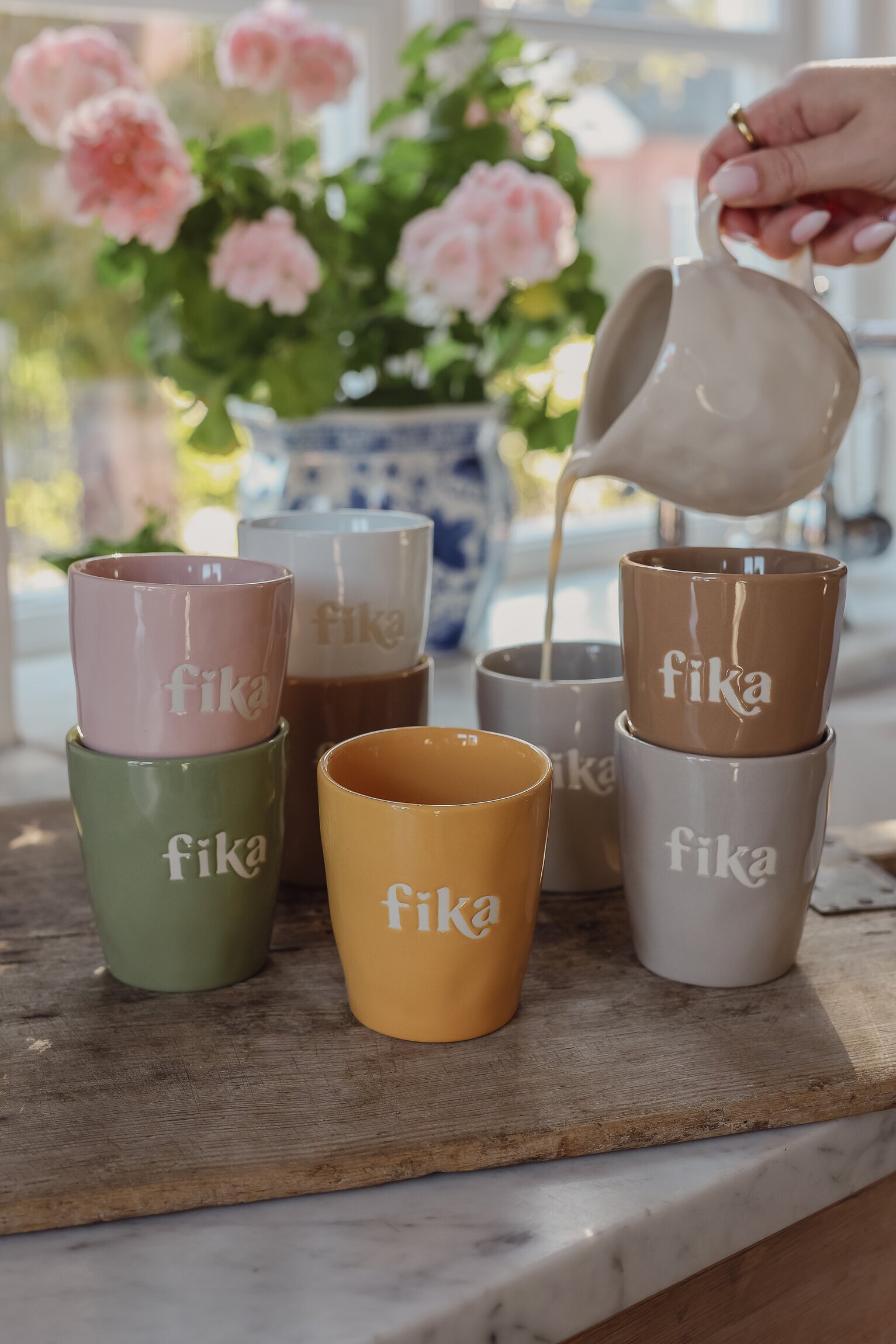 Majas muggar med texten Fika sprider värme i vardagen. De finns i flera fina färger och har en stilren silkscreen-text direkt i keramiken. Perfekta till kaffe, te eller varm choklad – och lika fina att blanda som att samla på.