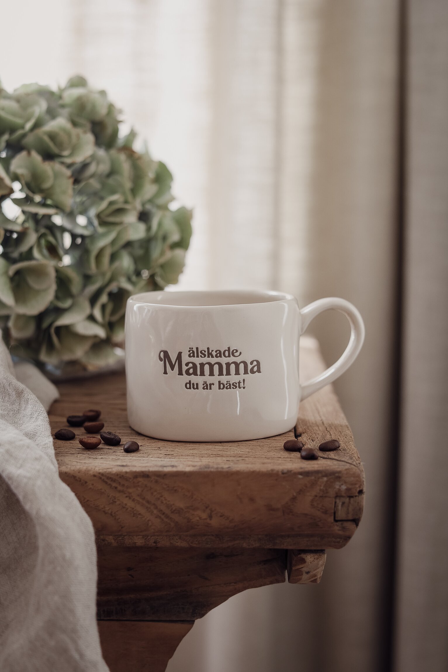 Mugg i stengods med texten Älskade mamma – en varm och omtänksam present till den du tycker extra mycket om. Läs mer
