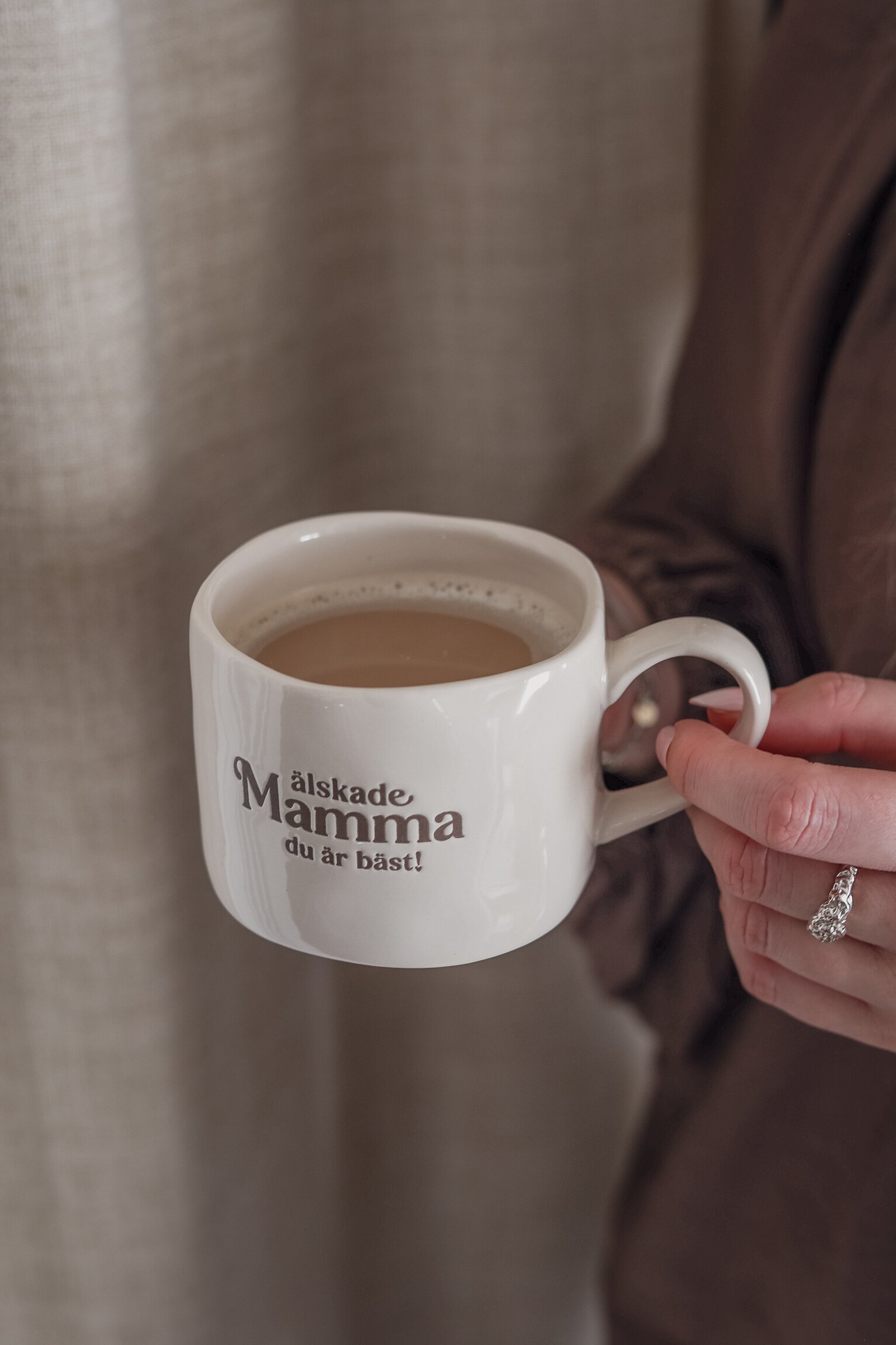 Mugg i stengods med texten Älskade mamma – en varm och omtänksam present till den du tycker extra mycket om. Den stilrena designen gör muggen lika fin till vardags som till mysiga fikastunder, och den passar perfekt att ge bort vid födelsedag eller bara som en liten överraskning.