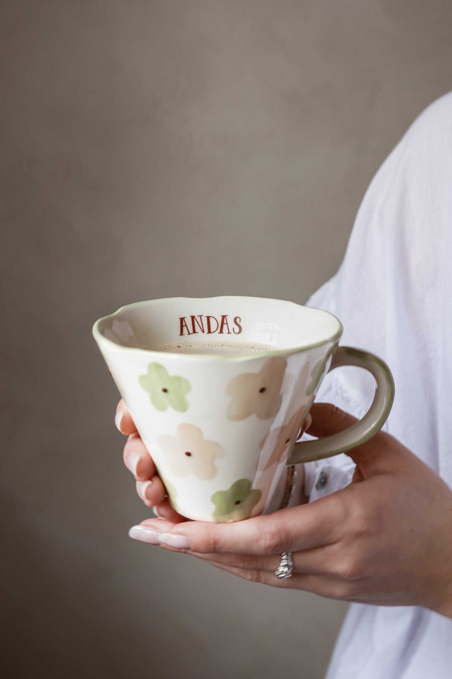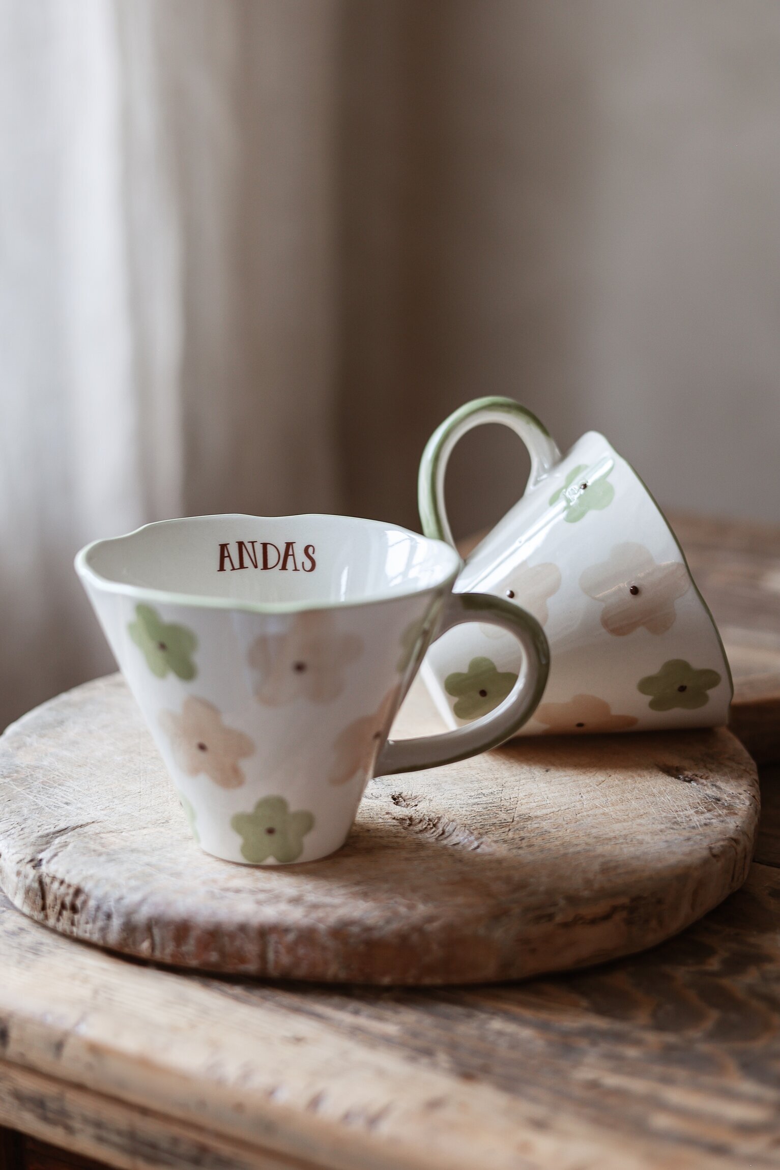 Muggen är dekorerad med handmålade blommor i milda gröna och beige toner, som skapar en lugn och harmonisk känsla.