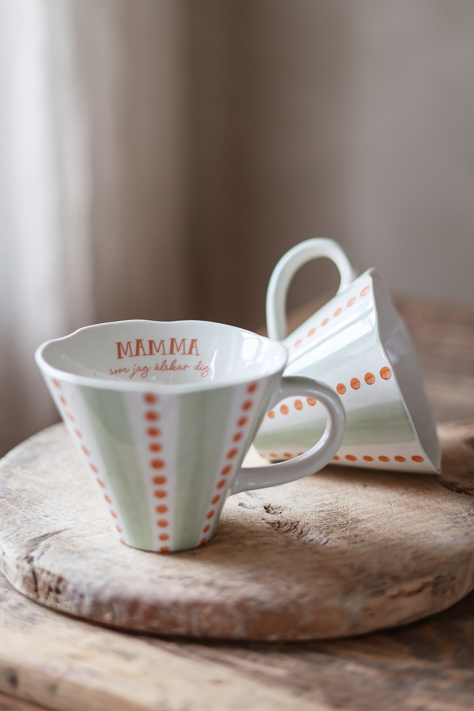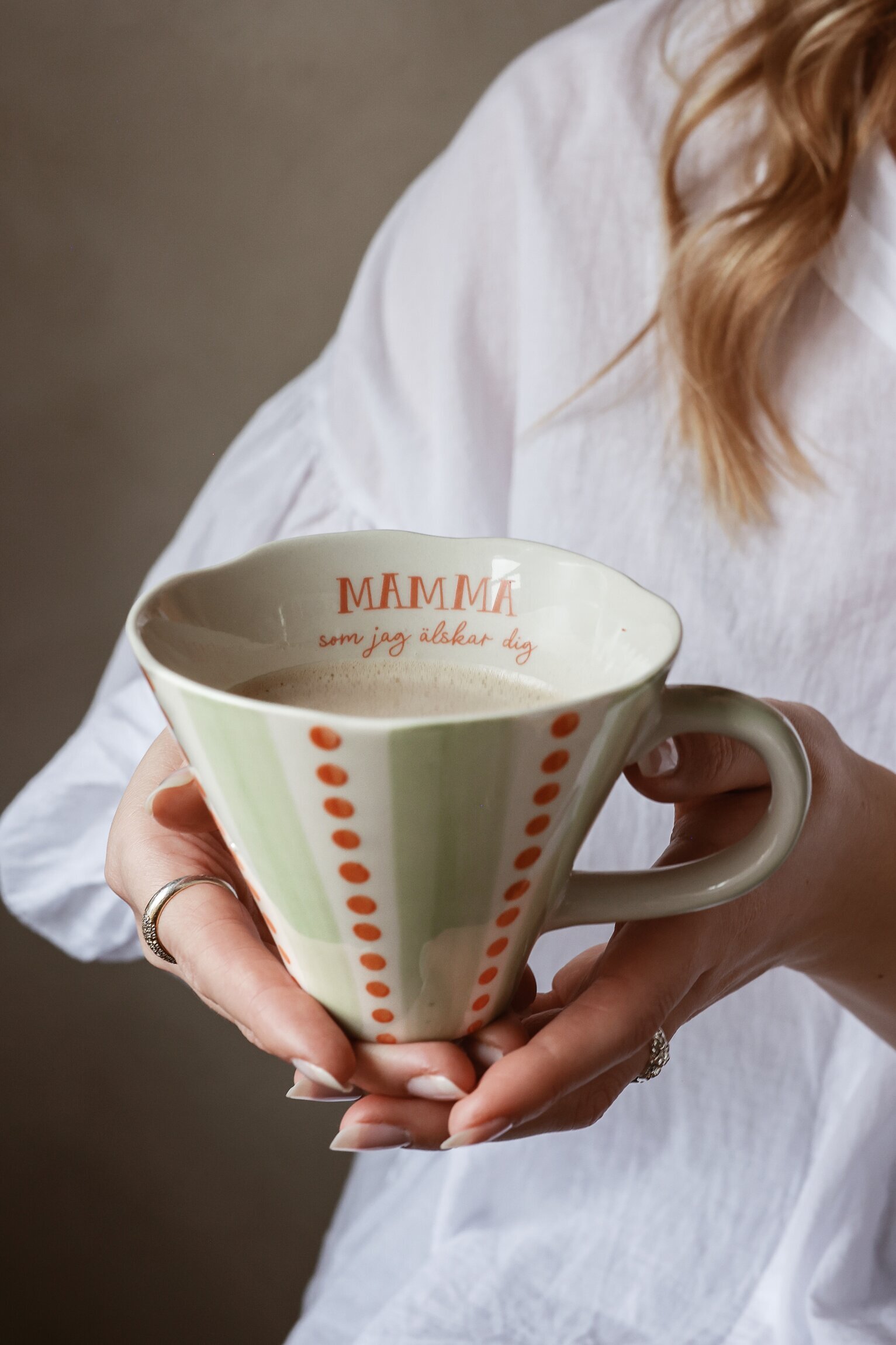 En ljuvlig mugg som förmedlar värme och kärlek – perfekt att ge till någon som betyder lite extra. Muggen är dekorerad med handmålade ränder och små glada prickar i mjuka pastelltoner. På insidan finns texten "Mamma som jag älskar dig", som gör varje fikastund ännu mer hjärtlig.