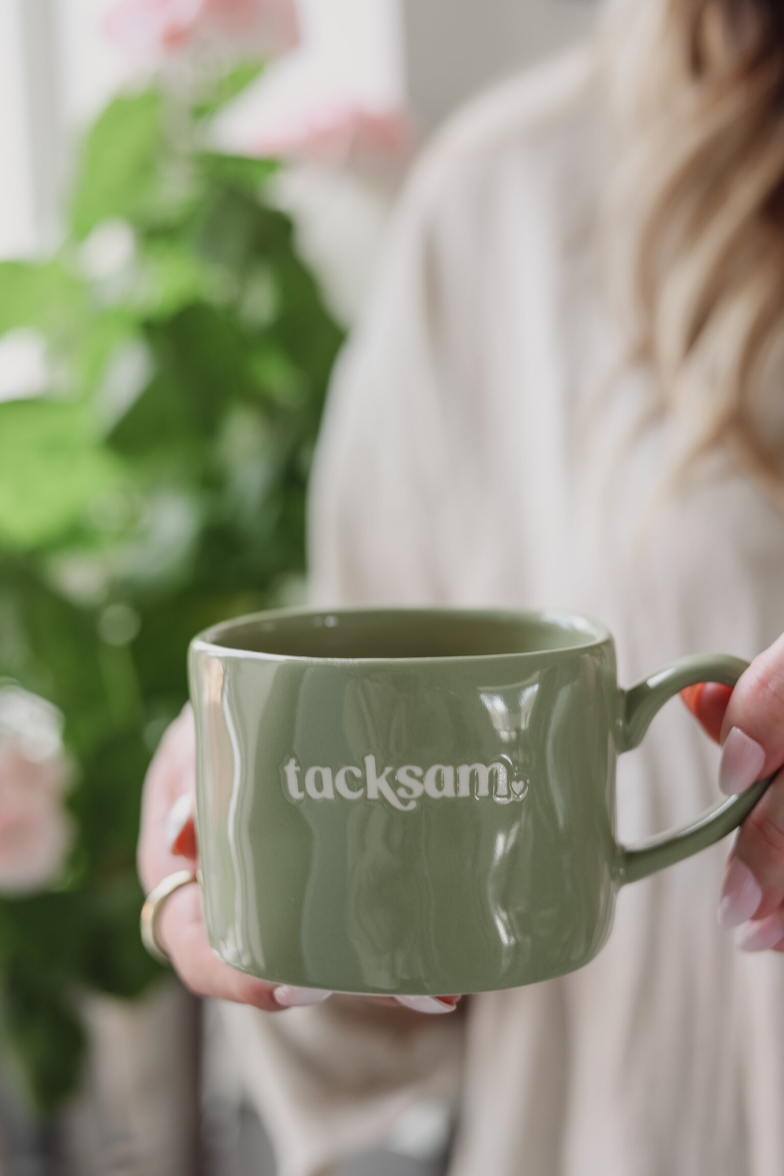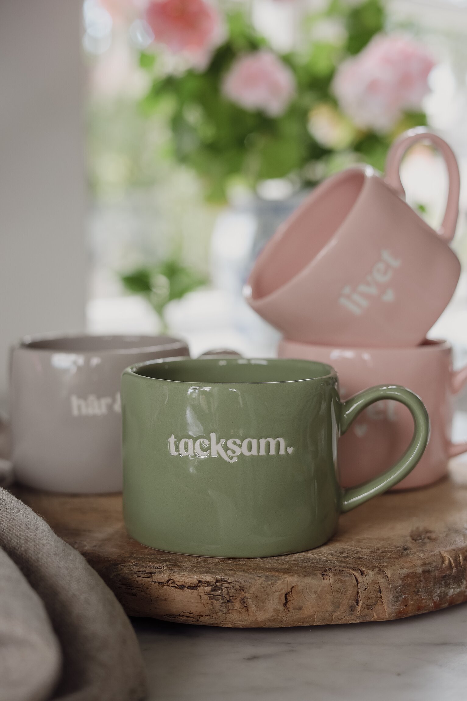 Den gröna muggen Tacksam från Majas Cottage kombinerar mjuk, organisk form med ett budskap som värmer lika mycket som drycken i den. Den handgjorda känslan och den diskreta silkscreen-texten i keramiken ger ett modernt, harmoniskt uttryck som passar lika fint i det stilrena köket som på soffbordet.