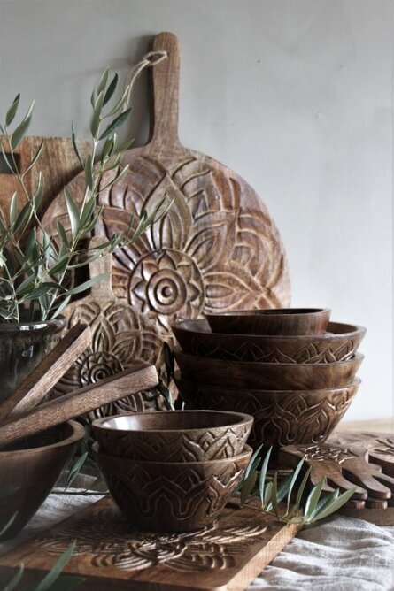 Skål tillverkad i mangoträ, en fin detalj till det dukade bordet. Träskålen har ett dekorativt mönster på dess utsida & finns i flera olika varianter. Från Majas Cottage.
