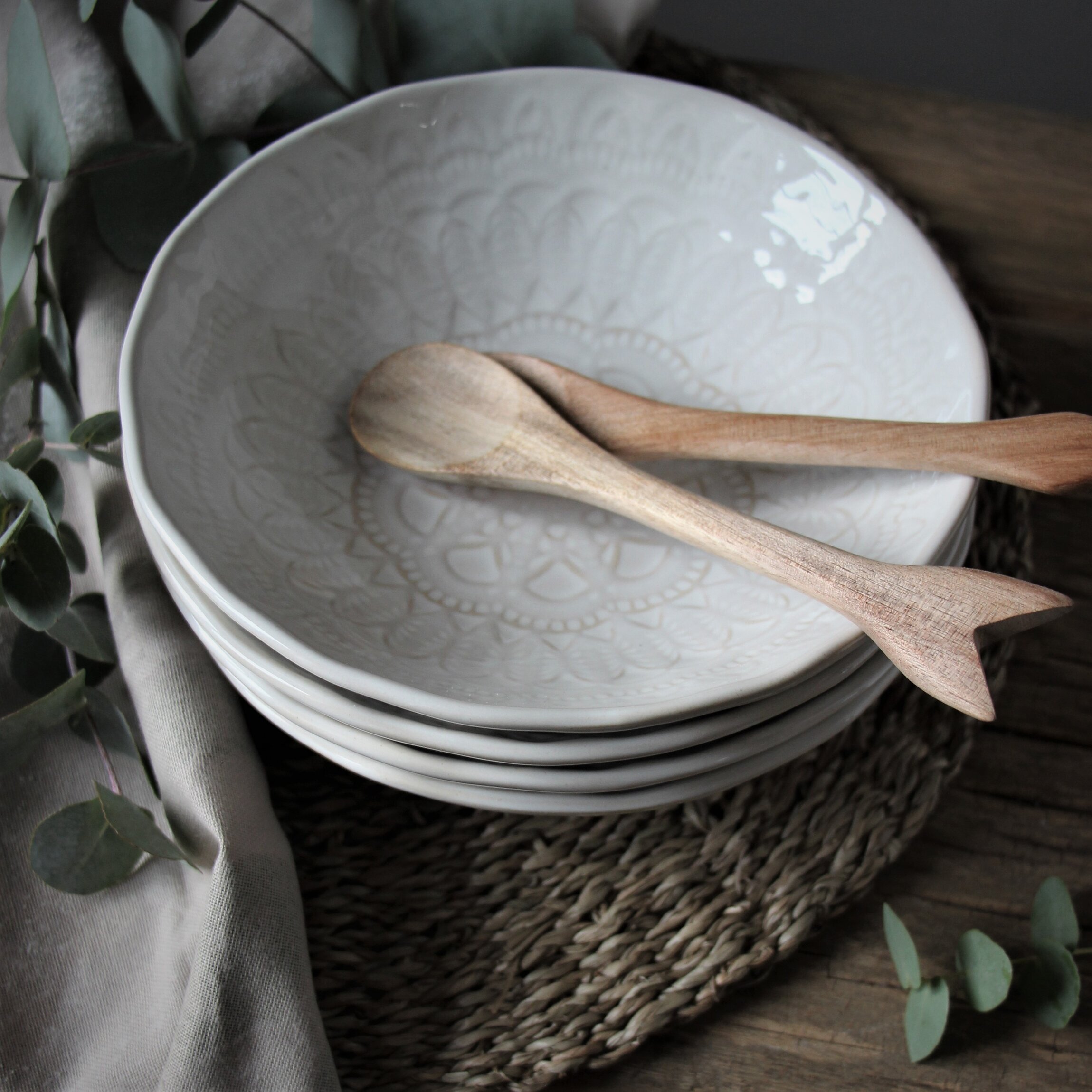 Skålarna vilar på en robust, flätad bordstablett som tillför en naturlig och jordnära känsla. Denna bas matchar vackert med de träbestick som ligger avslappnat överst på skålarna. Träbesticken är lätt utformade med släta, rundade kanter och en varm brun ton, vilket skapar en charmfull kontrast mot skålarnas ljusa yta.