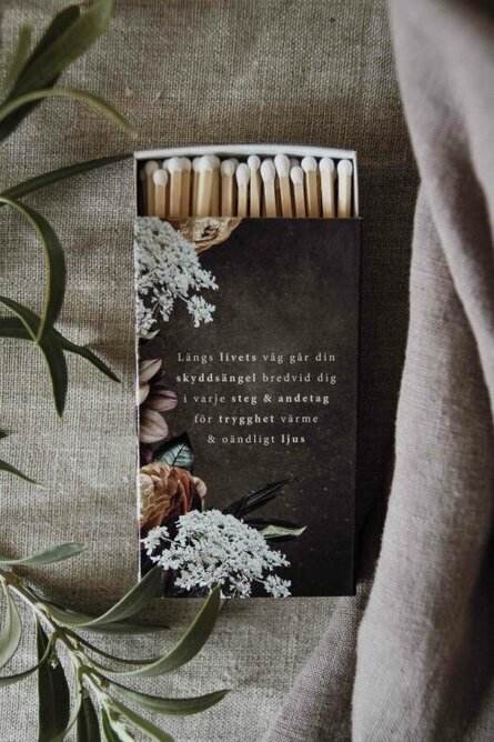 Långa tändstickor med vit topp, förpackade i en fin tändsticksask med vackert motiv samt text - Skyddsängel.