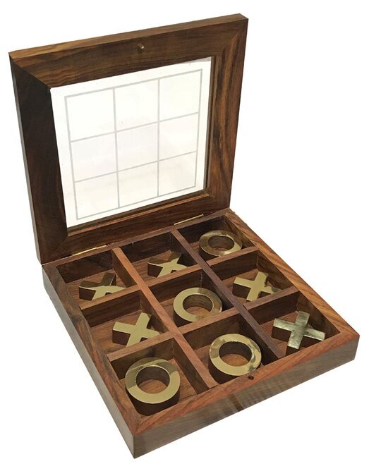 Dekorativ träbox innehållandes spelet tre i rad, en fin detalj från Miljögården.