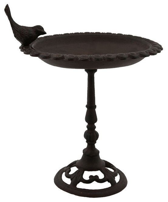 Vackert fågelbad på fot med dekorativa detaljer tillverkat i gjutjärn. Finns i två olika storlekar, från Miljögården.