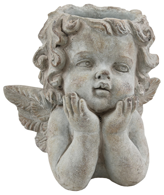 Bilden tydliggör att krukan sannolikt är gjuten, vilket syns i de subtila skuggningarna och texturen som ger djup och realism. Att använda den här änglaformade krukan i hemmet kan tillsätta en andlig eller nostalgisk ton till inredningen, och den är perfekt för små växter eller som en dekorativ detalj i sig.