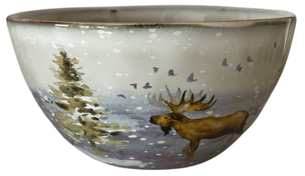 Skapa en stämningsfull dukning med denna vackra skål i stengods, dekorerad med ett handmålat vintermotiv av granar och en ståtlig älg i snöfall. Perfekt till frukostbordet eller till en varm, matig soppa. Den mjuka färgskalan och den rustika känslan gör att skålen passar lika bra till vardag som till fest.