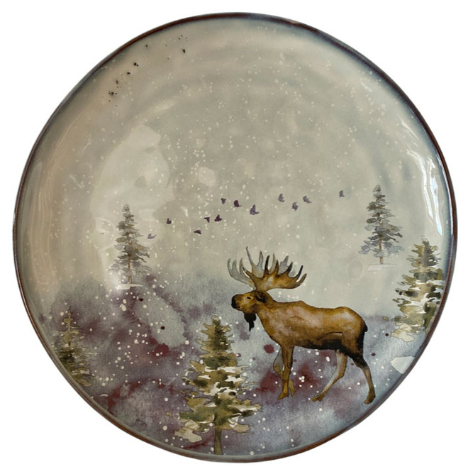 Skapa en stämningsfull dukning med denna vackra tallrik i stengods, dekorerad med ett handmålat vintermotiv av granar och en ståtlig älg. Perfekt till julbordet, vintermiddagar eller som en fin present. Den mjuka färgskalan och den rustika känslan gör att tallriken passar lika bra till vardag som till fest.