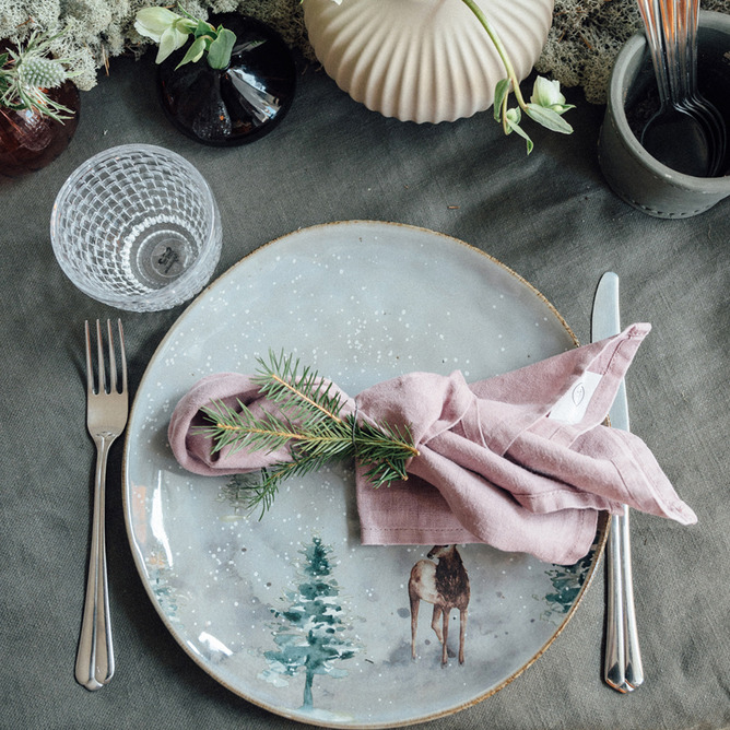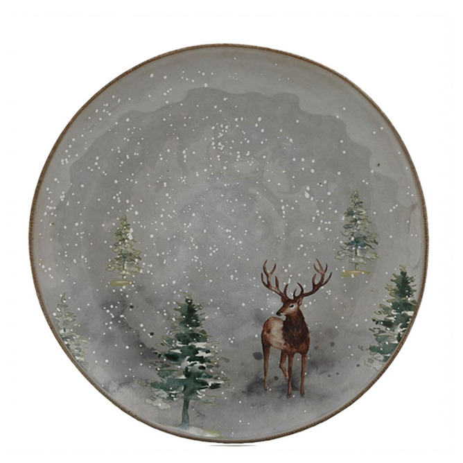 Skapa en stämningsfull dukning med denna vackra tallrik i stengods, dekorerad med ett handmålat vintermotiv av granar och en ståtlig hjort i snöfall. Perfekt till julbordet, vintermiddagar eller som en fin present. Den mjuka färgskalan och den rustika känslan gör att tallriken passar lika bra till vardag som till fest.