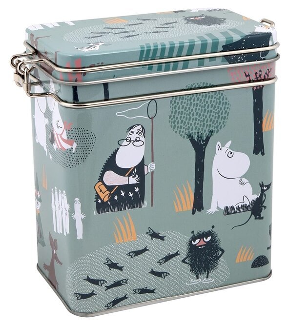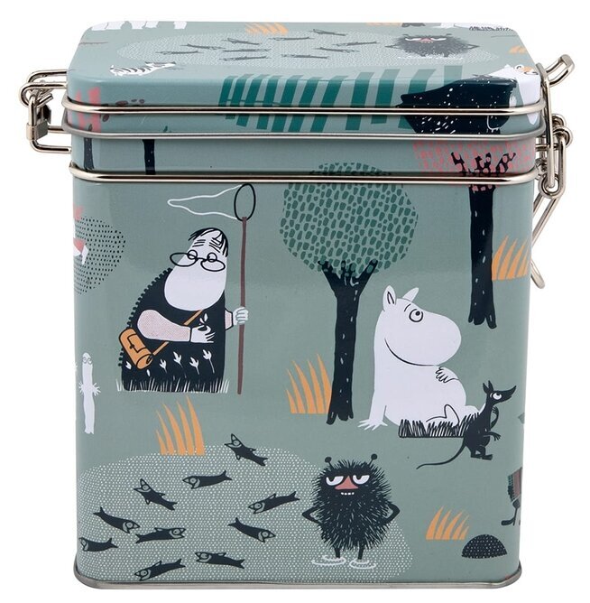 Te/espressoburk i plåt med snäpplås samt tätslutande lock. Plåtburken har ett färgglatt motiv med Mumintrollen på skogsutflykt. Handdisk samt noggrann torkning rekommenderas.