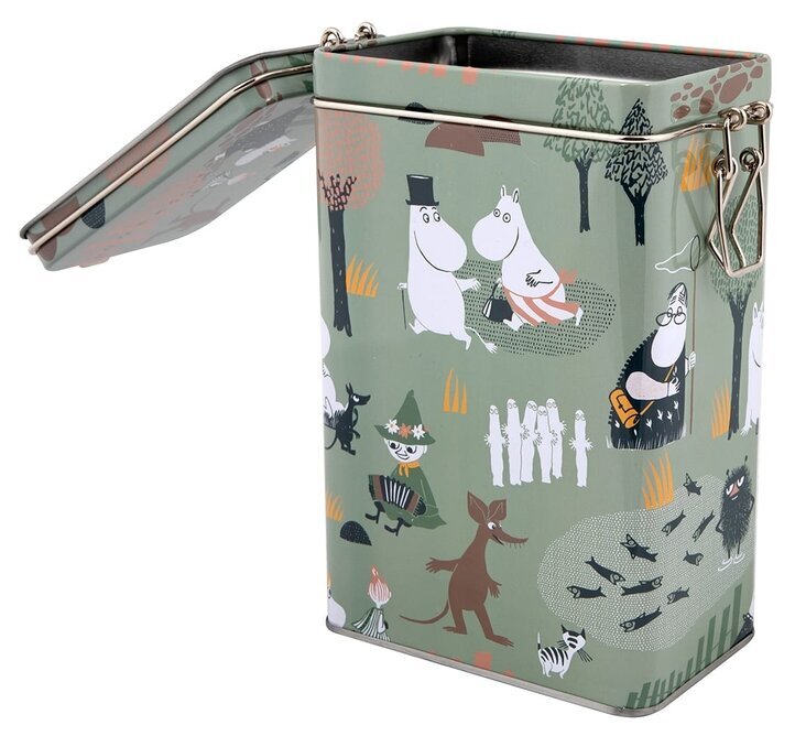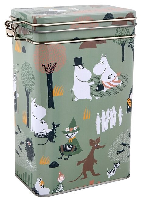 Kaffeburk i plåt med snäpplås samt tätslutande lock. Plåtburken har ett färgglatt motiv med Mumintrollen på skogsutflykt.